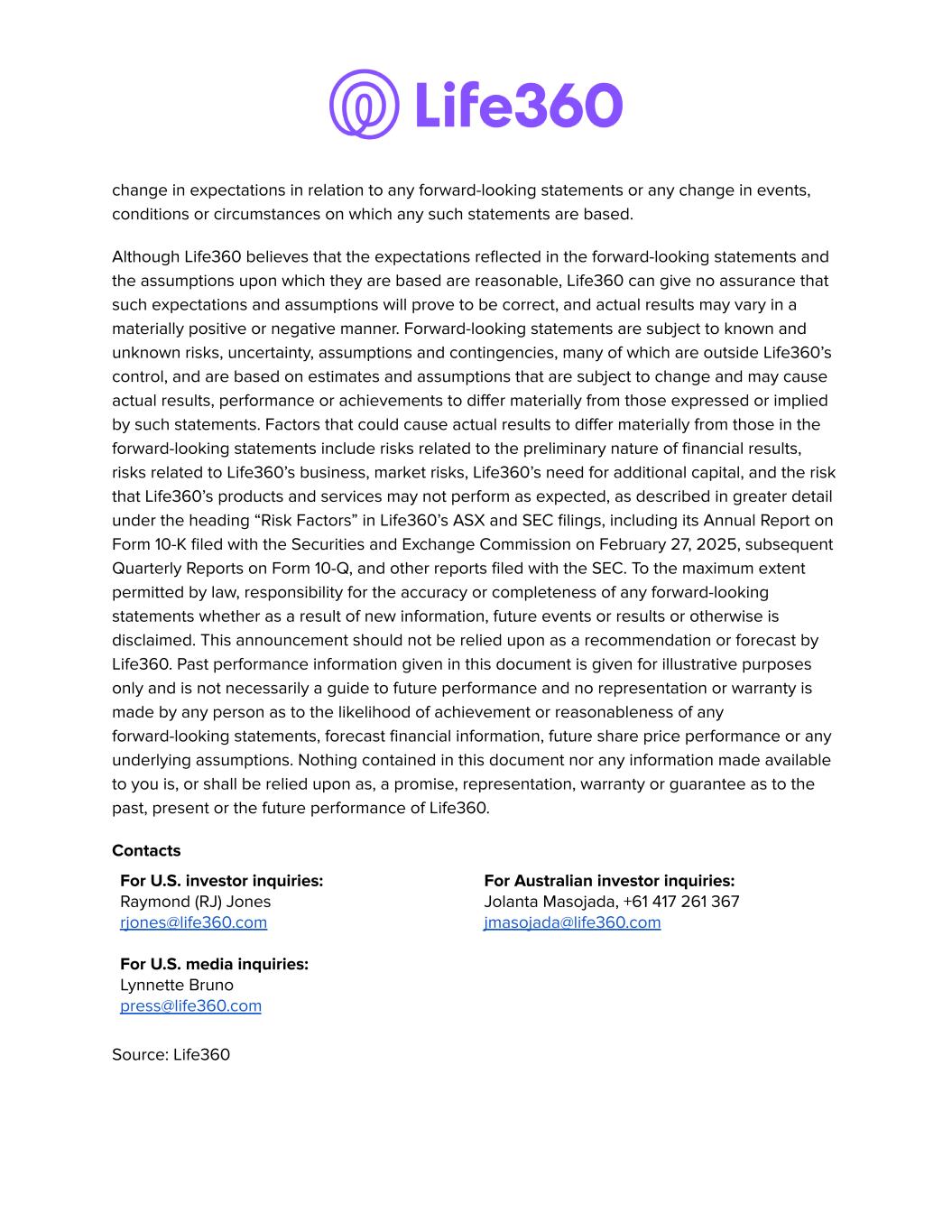 change in expectations in relation to any forward-looking statements or any change in events, conditions or circumstances on which any such statements are based. Although Life360 believes that the expectations reflected in the forward-looking statements and the assumptions upon which they are based are reasonable, Life360 can give no assurance that such expectations and assumptions will prove to be correct, and actual results may vary in a materially positive or negative manner. Forward-looking statements are subject to known and unknown risks, uncertainty, assumptions and contingencies, many of which are outside Life360’s control, and are based on estimates and assumptions that are subject to change and may cause actual results, performance or achievements to differ materially from those expressed or implied by such statements. Factors that could cause actual results to differ materially from those in the forward-looking statements include risks related to the preliminary nature of financial results, risks related to Life360’s business, market risks, Life360’s need for additional capital, and the risk that Life360’s products and services may not perform as expected, as described in greater detail under the heading “Risk Factors” in Life360’s ASX and SEC filings, including its Annual Report on Form 10-K filed with the Securities and Exchange Commission on February 27, 2025, subsequent Quarterly Reports on Form 10-Q, and other reports filed with the SEC. To the maximum extent permitted by law, responsibility for the accuracy or completeness of any forward-looking statements whether as a result of new information, future events or results or otherwise is disclaimed. This announcement should not be relied upon as a recommendation or forecast by Life360. Past performance information given in this document is given for illustrative purposes only and is not necessarily a guide to future performance and no representation or warranty is made by any person as to the likelihood of achievement or reasonableness of any forward-looking statements, forecast financial information, future share price performance or any underlying assumptions. Nothing contained in this document nor any information made available to you is, or shall be relied upon as, a promise, representation, warranty or guarantee as to the past, present or the future performance of Life360. Contacts For U.S. investor inquiries: Raymond (RJ) Jones rjones@life360.com For U.S. media inquiries: Lynnette Bruno press@life360.com For Australian investor inquiries: Jolanta Masojada, +61 417 261 367 jmasojada@life360.com Source: Life360