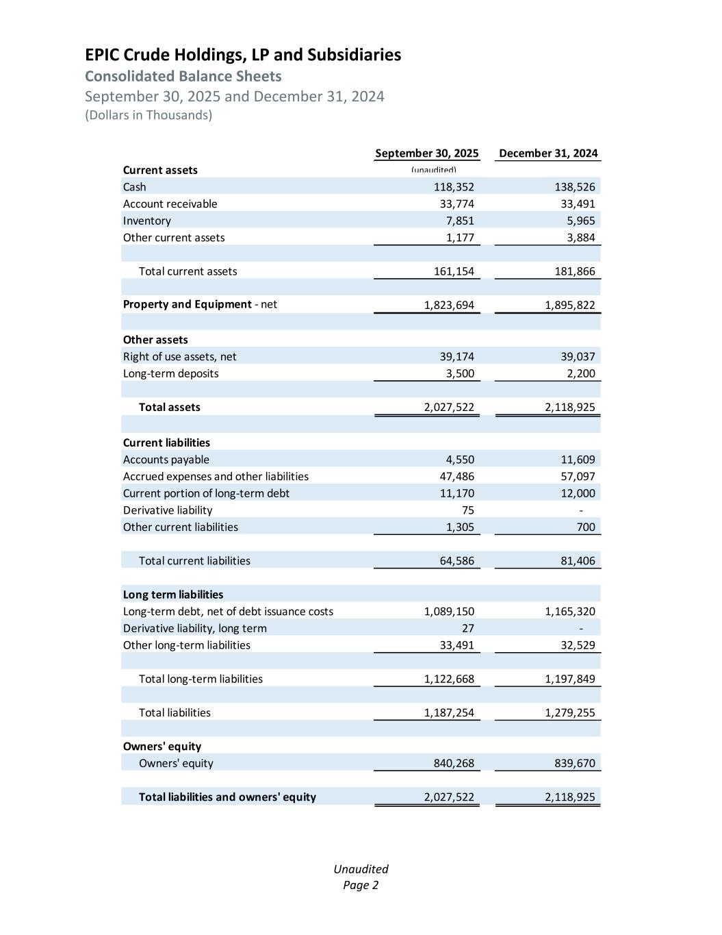 EPIC Crude Holdings, LP and Subsidiaries Consolidated Balance Sheets September 30, 2025 and December 31, 2024 (Dollars in Thousands) Unaudited Page 2 September 30, 2025 December 31, 2024 Current assets Cash 118,352 138,526 Account receivable 33,774 33,491 Inventory 7,851 5,965 Other current assets 1,177 3,884 Total current assets 161,154 181,866 Property and Equipment - net 1,823,694 1,895,822 Other assets Right of use assets, net 39,174 39,037 Long-term deposits 3,500 2,200 Total assets 2,027,522 2,118,925 Current liabilities Accounts payable 4,550 11,609 Accrued expenses and other liabilities 47,486 57,097 Current portion of long-term debt 11,170 12,000 Derivative liability 75 - Other current liabilities 1,305 700 Total current liabilities 64,586 81,406 Long term liabilities Long-term debt, net of debt issuance costs 1,089,150 1,165,320 Derivative liability, long term 27 - Other long-term liabilities 33,491 32,529 Total long-term liabilities 1,122,668 1,197,849 Total liabilities 1,187,254 1,279,255 Owners' equity Owners' equity 840,268 839,670 Total liabilities and owners' equity 2,027,522 2,118,925 (unaudited)
