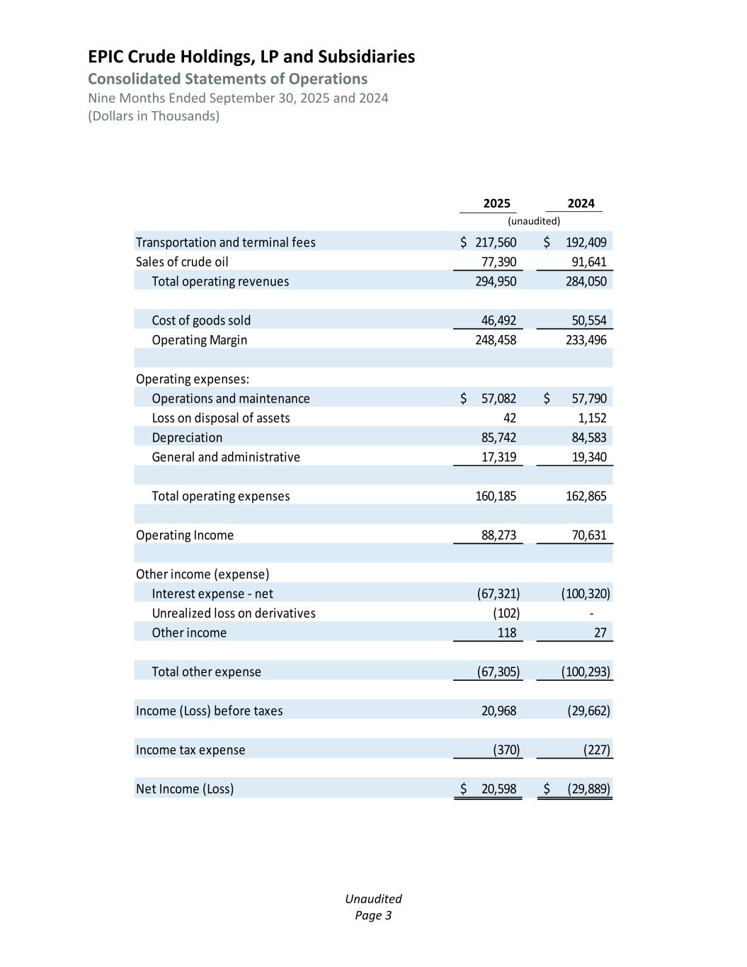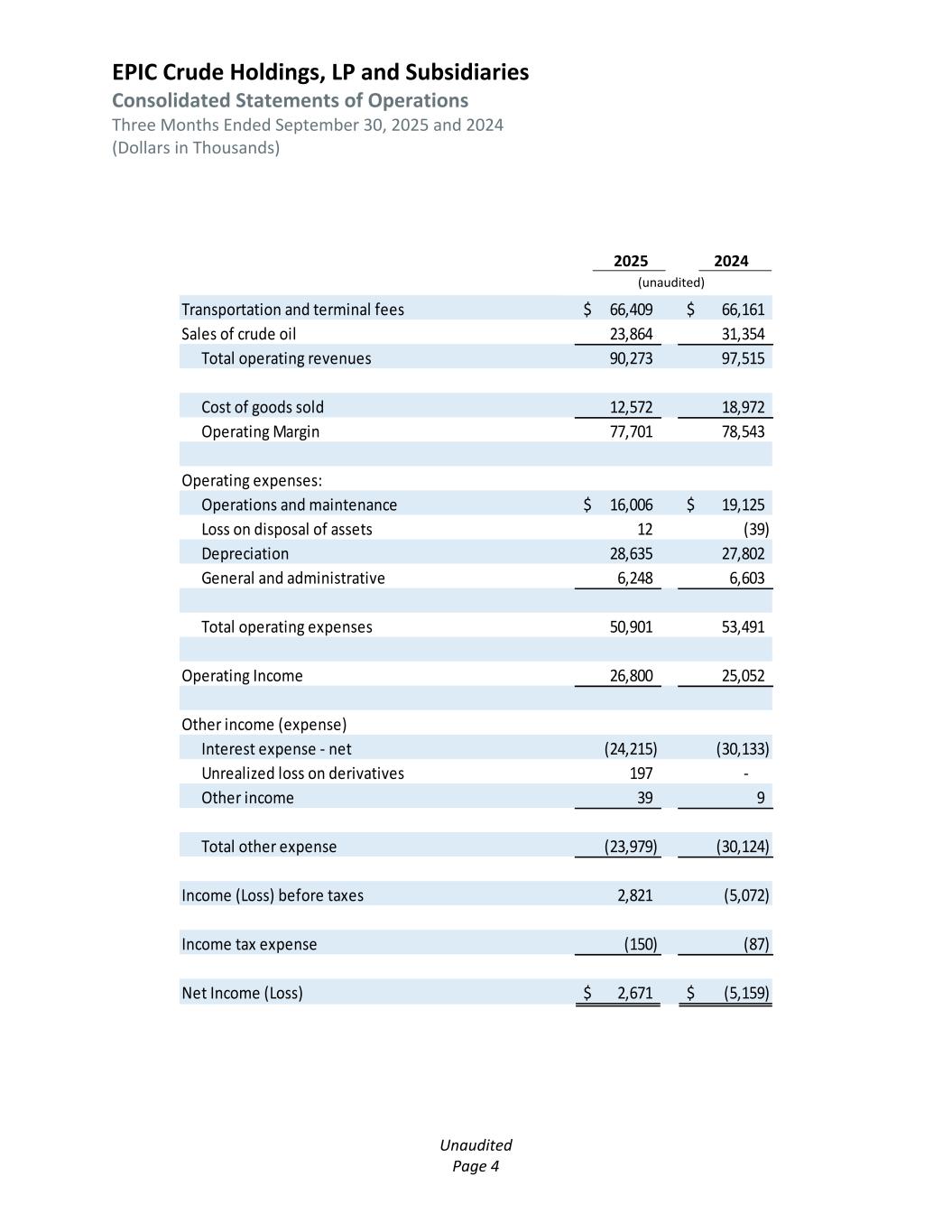 EPIC Crude Holdings, LP and Subsidiaries Consolidated Statements of Operations Nine Months Ended September 30, 2025 and 2024 (Dollars in Thousands) Unaudited Page 3 2025 2024 Transportation and terminal fees 217,560$ 192,409$ Sales of crude oil 77,390 91,641 Total operating revenues 294,950 284,050 Cost of goods sold 46,492 50,554 Operating Margin 248,458 233,496 Operating expenses: Operations and maintenance 57,082$ 57,790$ Loss on disposal of assets 42 1,152 Depreciation 85,742 84,583 General and administrative 17,319 19,340 Total operating expenses 160,185 162,865 Operating Income 88,273 70,631 Other income (expense) Interest expense - net (67,321) (100,320) Unrealized loss on derivatives (102) - Other income 118 27 Total other expense (67,305) (100,293) Income (Loss) before taxes 20,968 (29,662) Income tax expense (370) (227) Net Income (Loss) 20,598$ (29,889)$ 2025 2024 (unaudited)