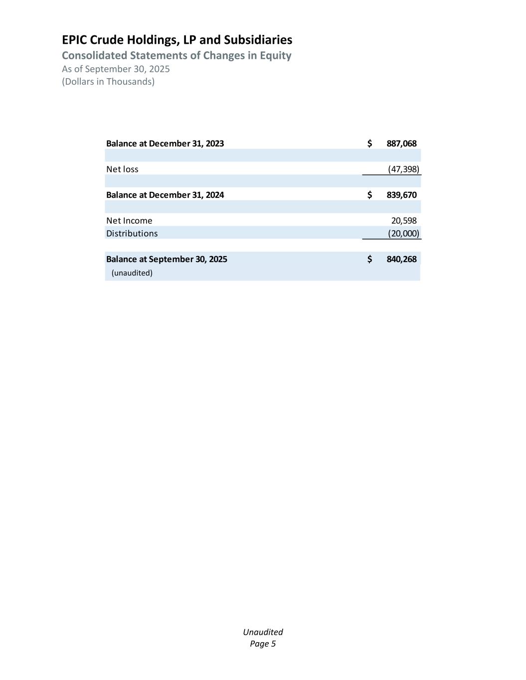 EPIC Crude Holdings, LP and Subsidiaries Consolidated Statements of Operations Three Months Ended September 30, 2025 and 2024 (Dollars in Thousands) Unaudited Page 4 2025 2024 Transportation and terminal fees 66,409$ 66,161$ Sales of crude oil 23,864 31,354 Total operating revenues 90,273 97,515 Cost of goods sold 12,572 18,972 Operating Margin 77,701 78,543 Operating expenses: Operations and maintenance 16,006$ 19,125$ Loss on disposal of assets 12 (39) Depreciation 28,635 27,802 General and administrative 6,248 6,603 Total operating expenses 50,901 53,491 Operating Income 26,800 25,052 Other income (expense) Interest expense - net (24,215) (30,133) Unrealized loss on derivatives 197 - Other income 39 9 Total other expense (23,979) (30,124) Income (Loss) before taxes 2,821 (5,072) Income tax expense (150) (87) Net Income (Loss) 2,671$ (5,159)$ 2025 2024 (unaudited)