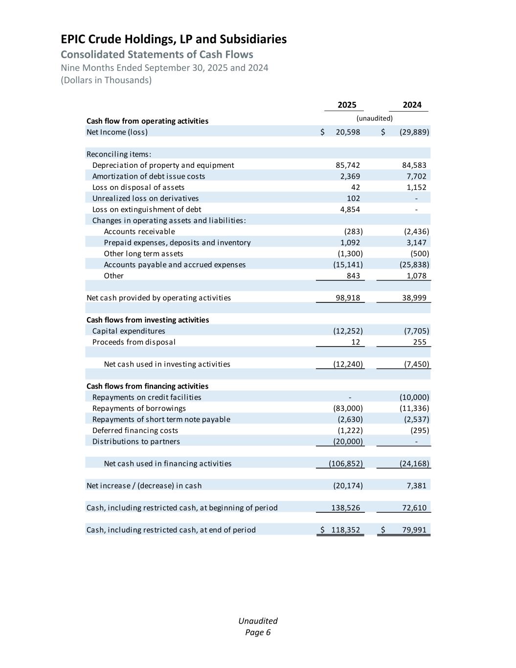 EPIC Crude Holdings, LP and Subsidiaries Consolidated Statements of Cash Flows Nine Months Ended September 30, 2025 and 2024 (Dollars in Thousands) Unaudited Page 6 2025 2024 Cash flow from operating activities Net Income (loss) 20,598$ (29,889)$ Reconciling items: Depreciation of property and equipment 85,742 84,583 Amortization of debt issue costs 2,369 7,702 Loss on disposal of assets 42 1,152 Unrealized loss on derivatives 102 - Loss on extinguishment of debt 4,854 - Changes in operating assets and liabil ities: Accounts receivable (283) (2,436) Prepaid expenses, deposits and inventory 1,092 3,147 Other long term assets (1,300) (500) Accounts payable and accrued expenses (15,141) (25,838) Other 843 1,078 Net cash provided by operating activities 98,918 38,999 Cash flows from investing activities Capital expenditures (12,252) (7,705) Proceeds from disposal 12 255 Net cash used in investing activities (12,240) (7,450) Cash flows from financing activities Repayments on credit facil ities - (10,000) Repayments of borrowings (83,000) (11,336) Repayments of short term note payable (2,630) (2,537) Deferred financing costs (1,222) (295) Distributions to partners (20,000) - Net cash used in financing activities (106,852) (24,168) Net increase / (decrease) in cash (20,174) 7,381 Cash, including restricted cash, at beginning of period 138,526 72,610 Cash, including restricted cash, at end of period 118,352$ 79,991$ (unaudited) 2025 2024