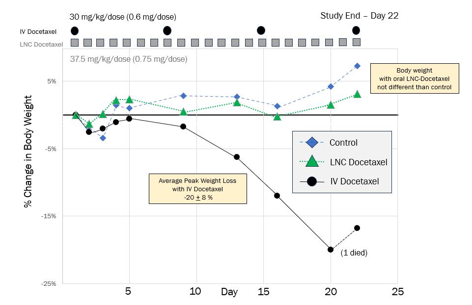 Daily oral LNC-docetaxel, at a total administered dose of more than 8x greater than IV-docetaxel, showed no evidence of weight loss, compared to an average peak weight loss of 20% with IV-docetaxel
