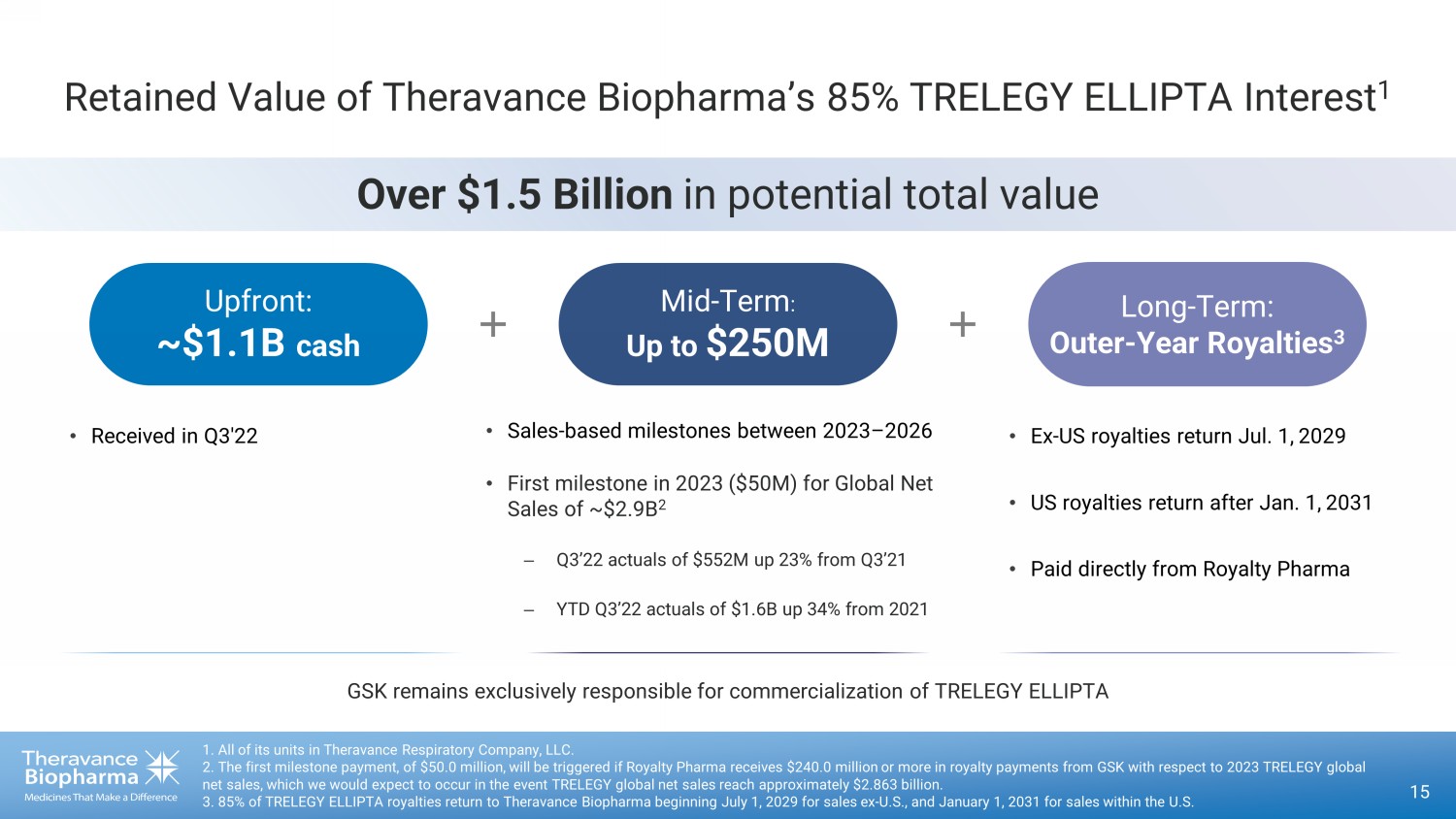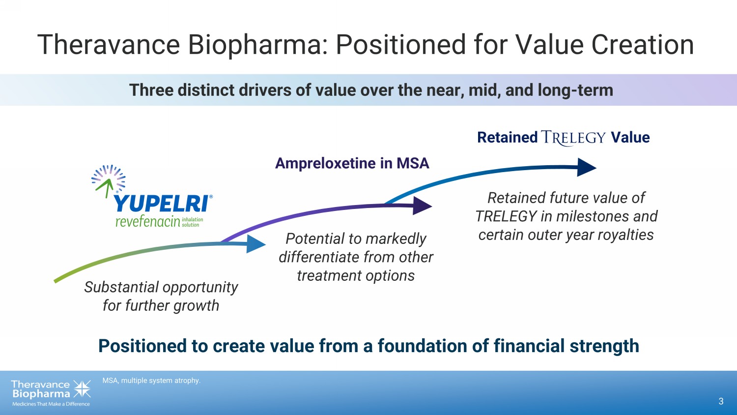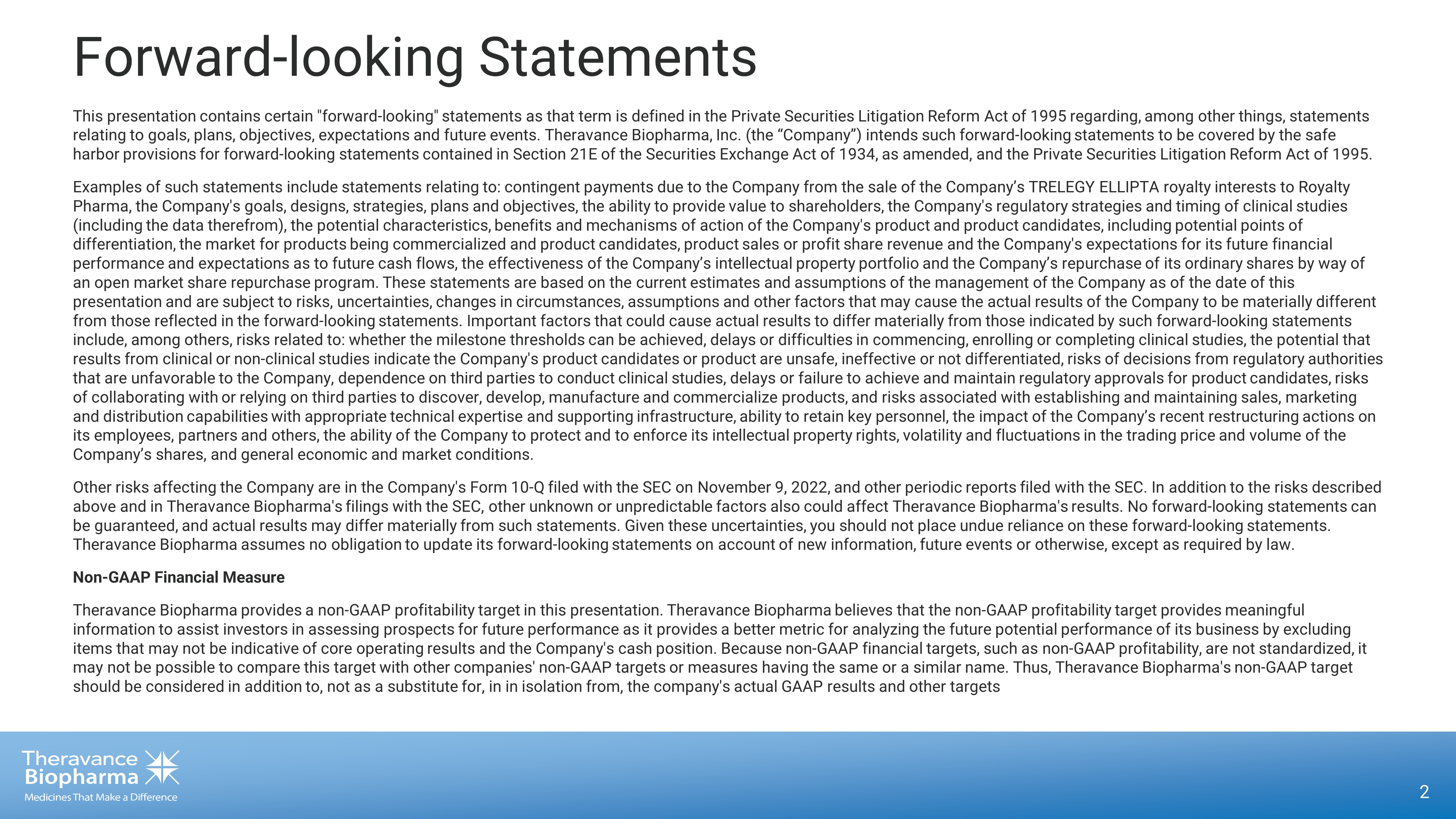 Forward-looking Statements This presentation contains certain "forward-looking" statements as that term is defined in the Private Securities Litigation Reform Act of 1995 regarding, among other things, statements relating to goals, plans, objectives, expectations and future events. Theravance Biopharma, Inc. (the "Company") intends suchforward-looking statements to be covered by the safe harbor provisions for forward-looking statements contained in Section 21E of the Securities Exchange Act of 1934, as amended, and the Private Securities Litigation Reform Act of 1995. Examples of such statements include statements relating to: contingent payments due to the Company from the sale of the Company's TRELEGY ELLIPTA royalty interests to Royalty Pharma, the Company's goals, designs, strategies, plans and objectives, the ability to provide value to shareholders, the Company's regulatory strategies and timing of clinical studies (including the data therefrom), the potential characteristics, benefits and mechanisms of action of the Company's product andproduct candidates, including potential points of differentiation, the market for products being commercialized and product candidates, product sales or profit share revenue and the Company's expectations for its future financial performance and expectations as to future cash flows, the effectiveness of the Company's intellectual property portfolioand theCompany's repurchase of its ordinary shares by way of an open market share repurchase program. These statements are based on the current estimates and assumptions of the management of the Company as of the date of this presentation and are subject to risks, uncertainties, changes in circumstances, assumptions and other factors that may cause theactual results of the Company to be materially different from those reflected in the forward-looking statements. Important factors that could cause actual results to differ materially from those indicated by such forward-looking statements include, among others, risks related to: whether the milestone thresholds can be achieved, delays or difficulties in commencing,enrolling or completing clinical studies, the potential that results from clinical or non-clinical studies indicate the Company's product candidates or product are unsafe, ineffective or not differentiated, risks of decisions from regulatory authorities that are unfavorable to the Company, dependence on third parties to conduct clinical studies, delays or failure to achieve and maintain regulatory approvals for product candidates, risks of collaborating with or relying on third parties to discover, develop, manufacture and commercialize products, and risks associated with establishing and maintaining sales, marketing and distribution capabilities with appropriate technical expertise and supporting infrastructure, ability to retain key personnel, the impact of the Company's recent restructuring actions on its employees, partners and others, the ability of the Company to protect and to enforce its intellectual property rights, volatility and fluctuations in the trading price and volume of the Company'sshares, and general economic and market conditions. Other risks affecting the Company are in the Company's Form 10-Q filed with the SEC on November 9, 2022, and other periodic reports filed with the SEC. In addition to the risks described above and in Theravance Biopharma's filings with the SEC, other unknown or unpredictable factors also could affect Theravance Biopharma's results. No forward-looking statements can be guaranteed, and actual results may differ materially from such statements. Given these uncertainties, you should not place undue reliance on these forward-looking statements. Theravance Biopharma assumes no obligation to update its forward-looking statements on account of new information, future events or otherwise, except as required by law. Non-GAAP Financial Measure Theravance Biopharma provides a non-GAAP profitability target in this presentation. Theravance Biopharma believes that the non-GAAP profitability target provides meaningful information to assist investors in assessing prospects for future performance as it provides a better metric for analyzing the future potential performance of its business by excluding items that may not be indicative of core operating results and the Company's cash position. Because non-GAAP financial targets, such as non-GAAP profitability, are not standardized, it may not be possible to compare this target with other companies' non-GAAP targets or measures having the same or a similar name. Thus, Theravance Biopharma's non-GAAP target should be considered in addition to, not as a substitute for, in in isolation from, the company's actual GAAP results and other targets