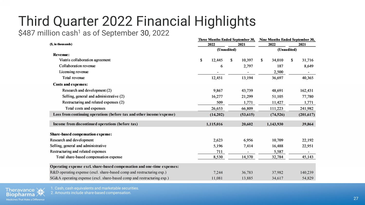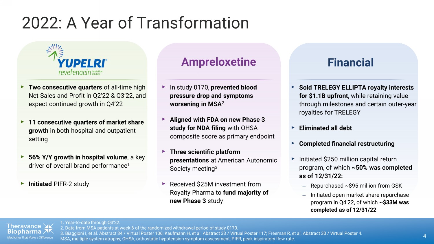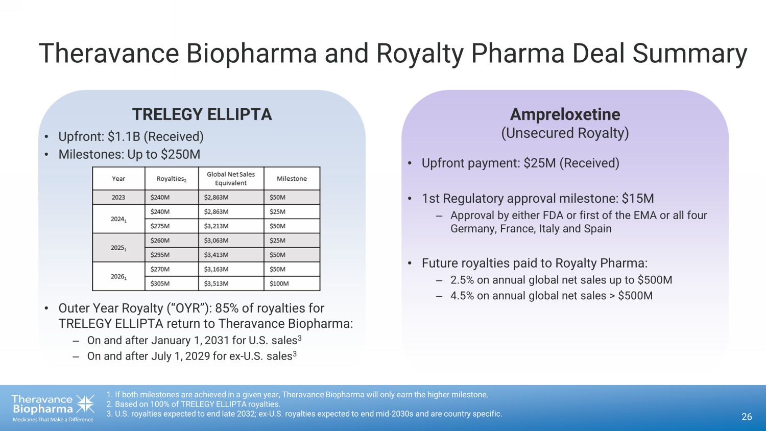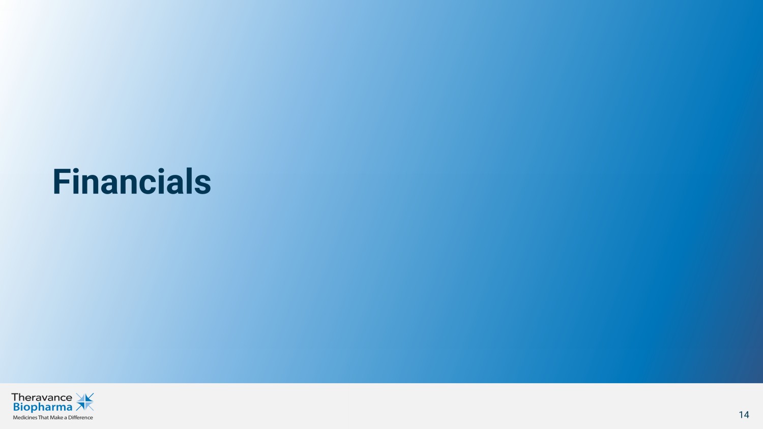 Forward-looking Statements This presentation contains certain "forward-looking" statements as that term is defined in the Private Securities Litigation Reform Act of 1995 regarding, among other things, statements relating to goals, plans, objectives, expectations and future events. Theravance Biopharma, Inc. (the "Company") intends suchforward-looking statements to be covered by the safe harbor provisions for forward-looking statements contained in Section 21E of the Securities Exchange Act of 1934, as amended, and the Private Securities Litigation Reform Act of 1995. Examples of such statements include statements relating to: contingent payments due to the Company from the sale of the Company's TRELEGY ELLIPTA royalty interests to Royalty Pharma, the Company's goals, designs, strategies, plans and objectives, the ability to provide value to shareholders, the Company's regulatory strategies and timing of clinical studies (including the data therefrom), the potential characteristics, benefits and mechanisms of action of the Company's product andproduct candidates, including potential points of differentiation, the market for products being commercialized and product candidates, product sales or profit share revenue and the Company's expectations for its future financial performance and expectations as to future cash flows, the effectiveness of the Company's intellectual property portfolioand theCompany's repurchase of its ordinary shares by way of an open market share repurchase program. These statements are based on the current estimates and assumptions of the management of the Company as of the date of this presentation and are subject to risks, uncertainties, changes in circumstances, assumptions and other factors that may cause theactual results of the Company to be materially different from those reflected in the forward-looking statements. Important factors that could cause actual results to differ materially from those indicated by such forward-looking statements include, among others, risks related to: whether the milestone thresholds can be achieved, delays or difficulties in commencing,enrolling or completing clinical studies, the potential that results from clinical or non-clinical studies indicate the Company's product candidates or product are unsafe, ineffective or not differentiated, risks of decisions from regulatory authorities that are unfavorable to the Company, dependence on third parties to conduct clinical studies, delays or failure to achieve and maintain regulatory approvals for product candidates, risks of collaborating with or relying on third parties to discover, develop, manufacture and commercialize products, and risks associated with establishing and maintaining sales, marketing and distribution capabilities with appropriate technical expertise and supporting infrastructure, ability to retain key personnel, the impact of the Company's recent restructuring actions on its employees, partners and others, the ability of the Company to protect and to enforce its intellectual property rights, volatility and fluctuations in the trading price and volume of the Company'sshares, and general economic and market conditions. Other risks affecting the Company are in the Company's Form 10-Q filed with the SEC on November 9, 2022, and other periodic reports filed with the SEC. In addition to the risks described above and in Theravance Biopharma's filings with the SEC, other unknown or unpredictable factors also could affect Theravance Biopharma's results. No forward-looking statements can be guaranteed, and actual results may differ materially from such statements. Given these uncertainties, you should not place undue reliance on these forward-looking statements. Theravance Biopharma assumes no obligation to update its forward-looking statements on account of new information, future events or otherwise, except as required by law. Non-GAAP Financial Measure Theravance Biopharma provides a non-GAAP profitability target in this presentation. Theravance Biopharma believes that the non-GAAP profitability target provides meaningful information to assist investors in assessing prospects for future performance as it provides a better metric for analyzing the future potential performance of its business by excluding items that may not be indicative of core operating results and the Company's cash position. Because non-GAAP financial targets, such as non-GAAP profitability, are not standardized, it may not be possible to compare this target with other companies' non-GAAP targets or measures having the same or a similar name. Thus, Theravance Biopharma's non-GAAP target should be considered in addition to, not as a substitute for, in in isolation from, the company's actual GAAP results and other targets