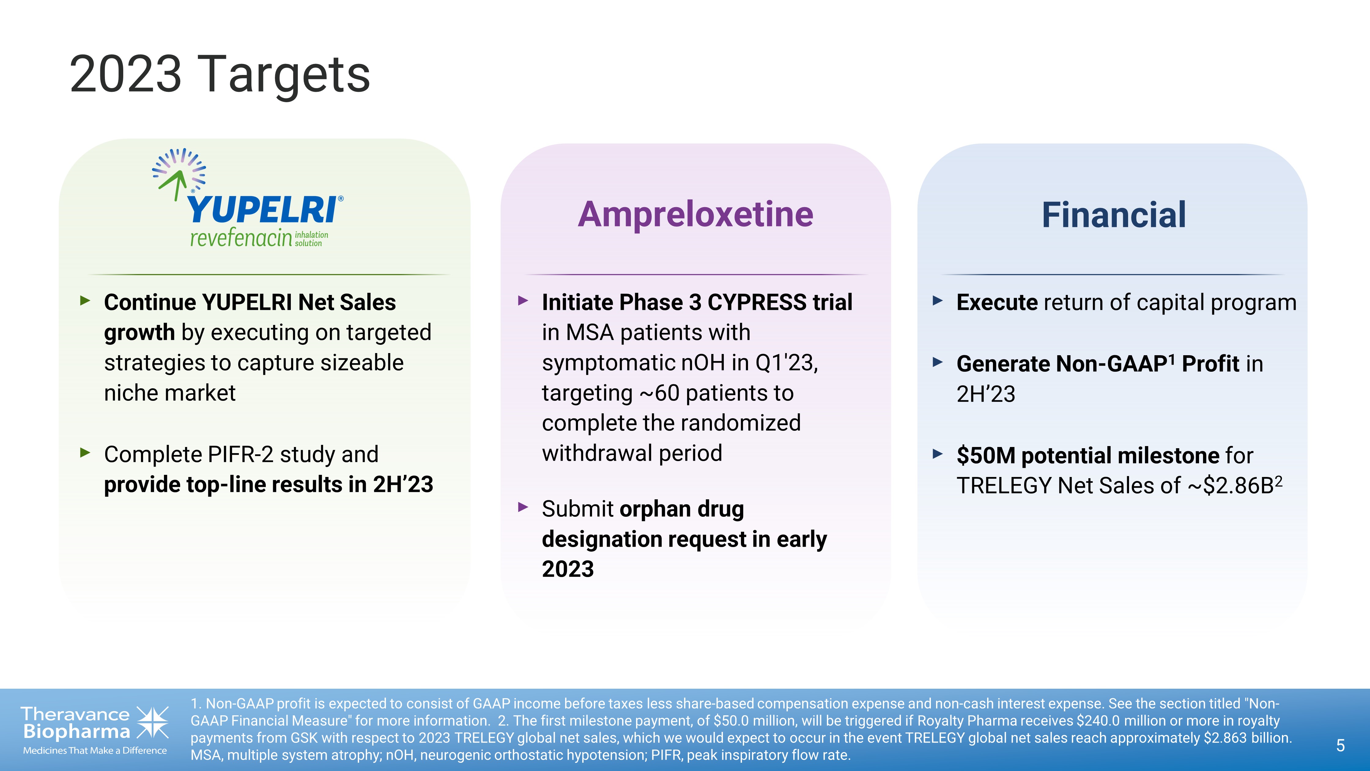 ‣ Sold TRELEGY ELLIPTA royalty interests for $1.1B upfront , while retaining value through milestones and certain outer - year royalties for TRELEGY ‣ Eliminated all debt ‣ Completed financial restructuring ‣ Initiated $250 million capital return program, of which ~50% was completed as of 12/31/22: – Repurchased ~$95 million from GSK – Initiated open market share repurchase program in Q4’22, of which ~$33M was completed as of 12/31/22 ‣ In study 0170, prevented blood pressure drop and symptoms worsening in MSA 2 ‣ Aligned with FDA on new Phase 3 study for NDA filing with OHSA composite score as primary endpoint ‣ Three scientific platform presentations at American Autonomic Society meeting 3 ‣ Received $25M investment from Royalty Pharma to fund majority of new Phase 3 study ‣ Two consecutive quarters of all - time ್ high Net Sales and Profit in Q2’22 & Q3’22, and expect continued growth in Q4’22 ‣ 11 consecutive quarters of market share growth in both hospital and outpatient setting ‣ 56% Y/Y growth in hospital volume , a key driver of overall brand performance 1 ‣ Initiated PIFR - 2 study 2022: A Year of Transformation 4 1. Year - to - date through Q3’22. 2. Data from MSA patients at week 6 of the randomized withdrawal period of study 0170. 3. Biaggioni I, et al. Abstract 34 / Virtual Poster 106; Kaufmann H, et al. Abstract 33 / Virtual Poster 117; Freeman R, et al. Abstract 30 / Virtual Poster 4. MSA, multiple system atrophy; OHSA, orthostatic hypotension symptom assessment; PIFR, peak inspiratory flow rate. Financial Ampreloxetine