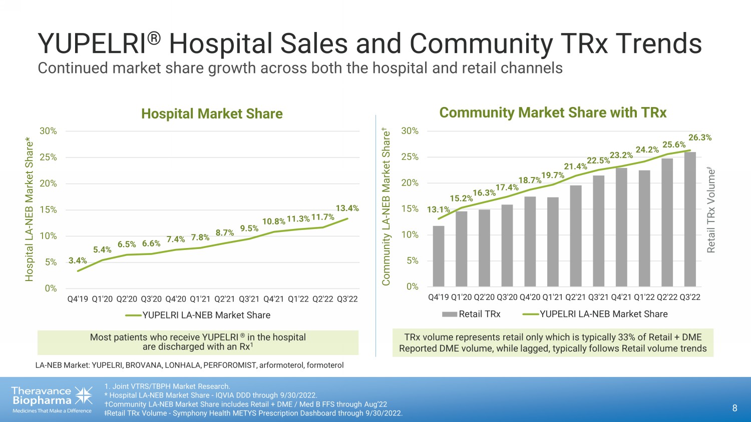 78,090 93,360 97,650 107,670 113,220 K 20 K 40 K 60 K 80 K 100 K 120 K Q3'21 Q4'21 Q1'22 Q2'22 Q3'22 $13.8 $15.3 $15.3 $17.2 $18.7 0 4 8 12 16 20 Q3'21 Q4'21 Q1'22 Q2'22 Q3'22 YUPELRI ® | Growing Net Sales and Hospital Volume 7 Source: IQVIA DDD, HDS, VA and Non - Reporting Hospital through 9/30/2022. See TBPH 10K filed February 28, 2022 for greater detail re TBPH implied 35%. Quarterly YUPELRI Hospital Doses Hospital doses sold increased 45% Q3’22 vs. Q3’21 TBPH Implied 35% of Total Net Sales ($M) Net sales increased 35% Q3’22 vs. Q3’21