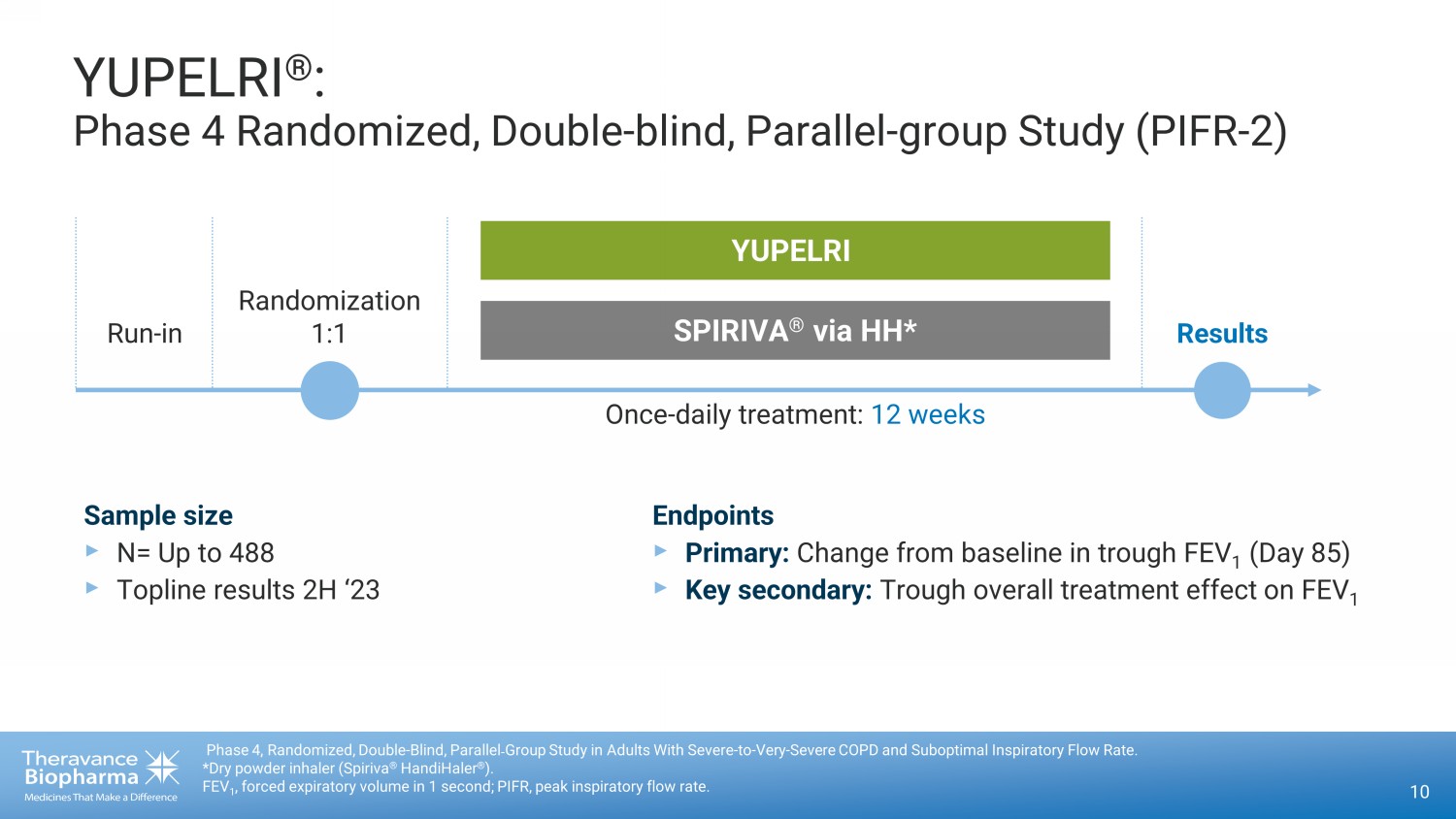 Substantial Opportunity for Further YUPELRI ® Growth Once - Daily Nebulized LAMA COPD treatment represents a sizeable niche market 9 1. American Lung Association. 2. Clarivate COPD Disease Landscape & Forecast US 2021. 3. Revefenacin COPD Joint Venture Research 2016. COPD, chronic obstructive pulmonary disease; DME, durable medical equipment; LAMA, long - acting muscarinic antagonist; PIFR, peak inspiratory flow rate. YUPELRI may be appropriate for COPD patients, including but not limited to: ► Moderate - to - very - severe COPD (73 – 92% 4 ); once - daily LAMAs are first - line therapy for moderate - to - very severe COPD patients ► Patients with suboptimal PIFR (19 – 78% of COPD patients 5 ) ► Patients with cognitive or dexterity challenges ~36% of COPD patients present episodes of cognitive impairment; ~33% of elderly patients have inadequate hand strength for inhalers 6 ► Patients inappropriately using short - acting nebulized treatment as maintenance therapy ► Patients transitioning from hospital to home care after being stabilized on nebulized treatment during hospitalization Growth opportunities within numerous patient segments 4. Safka KA, et al. Chronic Obstr Pulm Dis 2017. 5. Mahler DA, et al. Chronic Obstr Pulm Dis 2019. 6. Armitage JM, Williams SJ Inhaler technique in the elderly. Age Ageing 1988 17:275 - 278. Estimated 2021 YUPELRI Patient Funnel (US) ► COPD is under - diagnosed 1 ► COPD patients with or without symptoms may be treated with rescue and/or maintenance therapies ► Estimated patient counts from volume using average ‘days of therapy’ assumptions vary considerably across DME and retail channels Patent No 11,484,531, methods of treating COPD, expiring in 2039, is now listed in the Approved Drug Products with Therapeutic Equivalence Evaluations