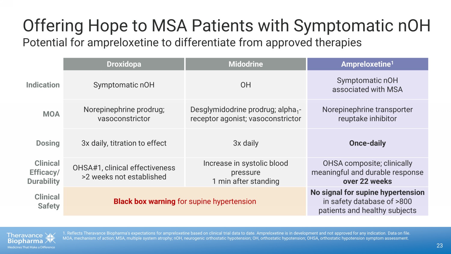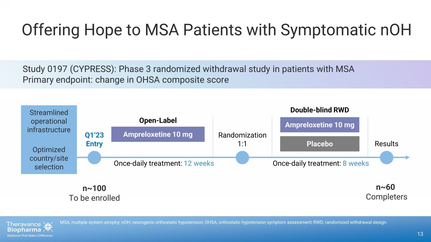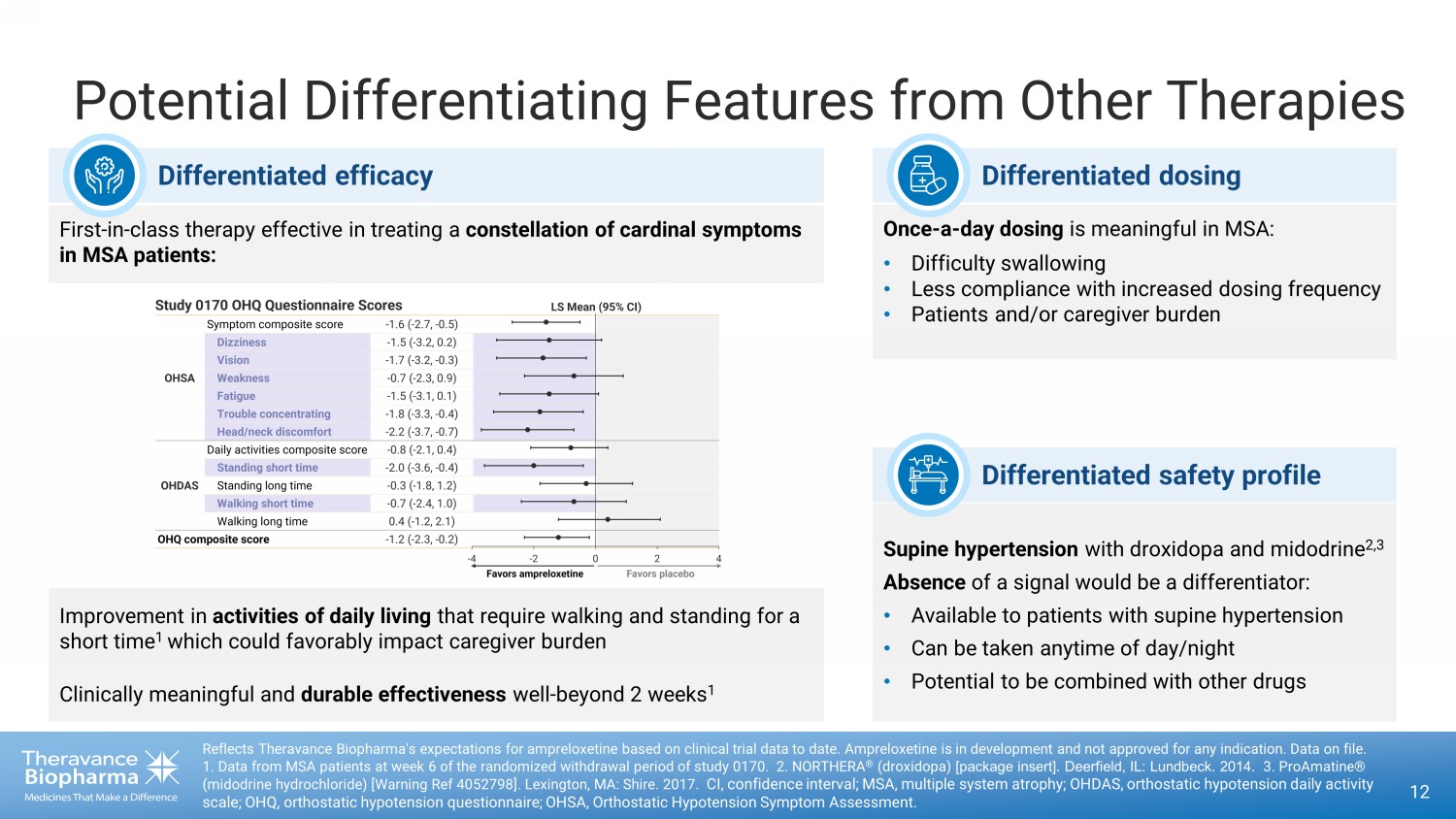 First - in - class therapy effective in treating a constellation of cardinal symptoms in MSA patients: Potential Differentiating Features from Other Therapies 12 Reflects Theravance Biopharma's expectations for ampreloxetine based on clinical trial data to date. Ampreloxetine is in development and not approved for any indication. Data on file. 1. Data from MSA patients at week 6 of the randomized withdrawal period of study 0170. 2. NORTHERA ® (droxidopa) [package insert]. Deerfield, IL: Lundbeck. 2014. 3. ProAmatine ® (midodrine hydrochloride) [Warning Ref 4052798]. Lexington, MA: Shire. 2017. CI, confidence interval; MSA, multiple system atrophy; OHDAS, orthostatic hypotension daily activity scale; OHQ, orthostatic hypotension questionnaire; OHSA, Orthostatic Hypotension Symptom Assessment. Supine hypertension with droxidopa and midodrine 2,3 Absence of a signal would be a differentiator: • Available to patients with supine hypertension • Can be taken anytime of day/night • Potential to be combined with other drugs Differentiated safety profile Differentiated efficacy Once - a - day dosing is meaningful in MSA: • Difficulty swallowing • Less compliance with increased dosing frequency • Patients and/or caregiver burden Differentiated dosing Improvement in activities of daily living that require w alking and standing for a short time 1 which could favorably impact caregiver burden Clinically meaningful and durable effectiveness well - beyond 2 weeks 1
