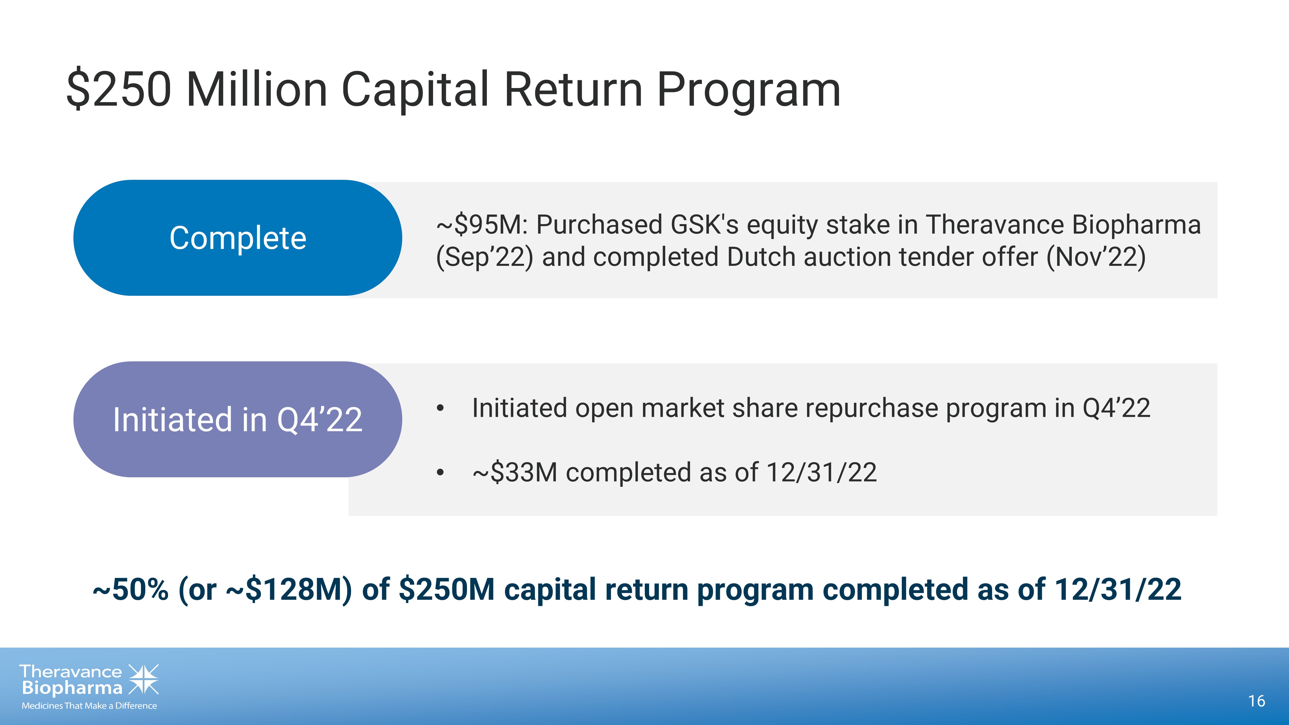~$95M: Purchased GSK's equity stake in Theravance Biopharma (Sep'22) and completed Dutch auction tender offer (Nov'oInitiated open market share repurchase program in Q4'22oo~$33M completed as of 12/31/22$250 Million Capital Return Program16CompleteInitiated in Q4'22~50% (or ~$128M) of $250M capital return program completed as of 12/31/22