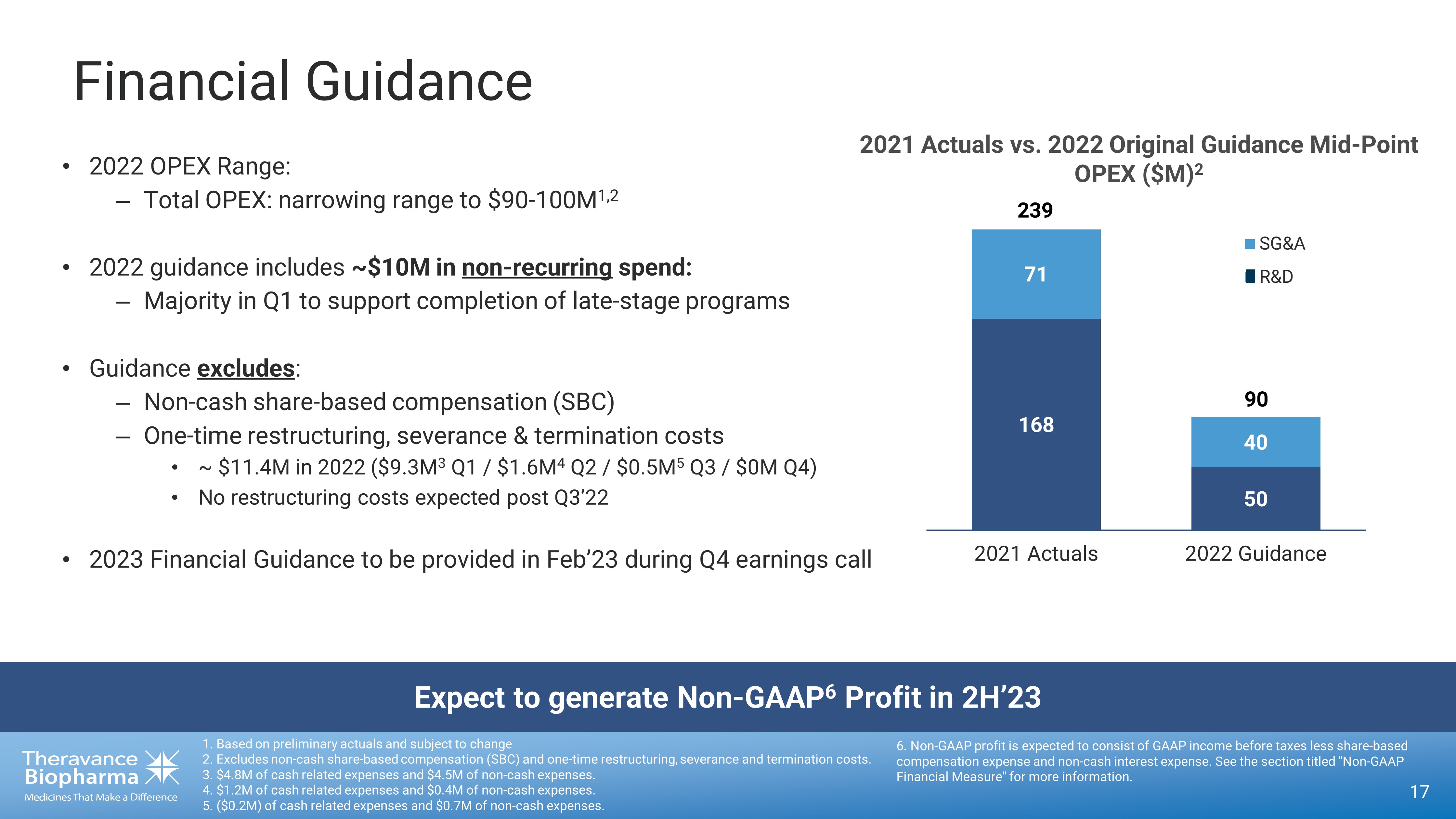 Financial Guidanceo2022 OPEX Range:-Total OPEX: narrowing range to $90 100M 1,2o2022 guidance includes ~$10M in non recurring spend:-Majority in Q1 to support completion of late stage programsoGuidance excludes-Non cash share based compensation (SBC)-One time restructuring, severance termination costsoo~ $11.4M in 2022 ($9.3M 3 Q1 / $1.6M 4 Q2 / $0.5M 5 Q3 / $0M Q4)oNo restructuring costs expected post Q3'22o2023 Financial Guidance to be provided in Feb'23 during Q4 earningscall171. Based on preliminary actuals and subject to change2. Excludesnon cash share based compensation (SBC) and one time restructuring, severance and termination costs.3. $4.8M of cash related expenses and $4.5M of noncash expenses.4. $1.2M of cash related expenses and $0.4M of noncash expenses. 5. ($0.2M) of cash related expenses and $0.7M of non cash expenses. Expect to generate Non GAAP 6 Profit in 2H'23 1685071402021 Actuals2022 GuidanceSG Actuals vs. 2022 Original Guidance MidPointOPEX ($M)2239906. NonGAAP profit is expected to consist of GAAP income before taxes less sharebased compensation expense and non cash interest expense. See the section titled"Non GAAP Financial Measure" for more information.23