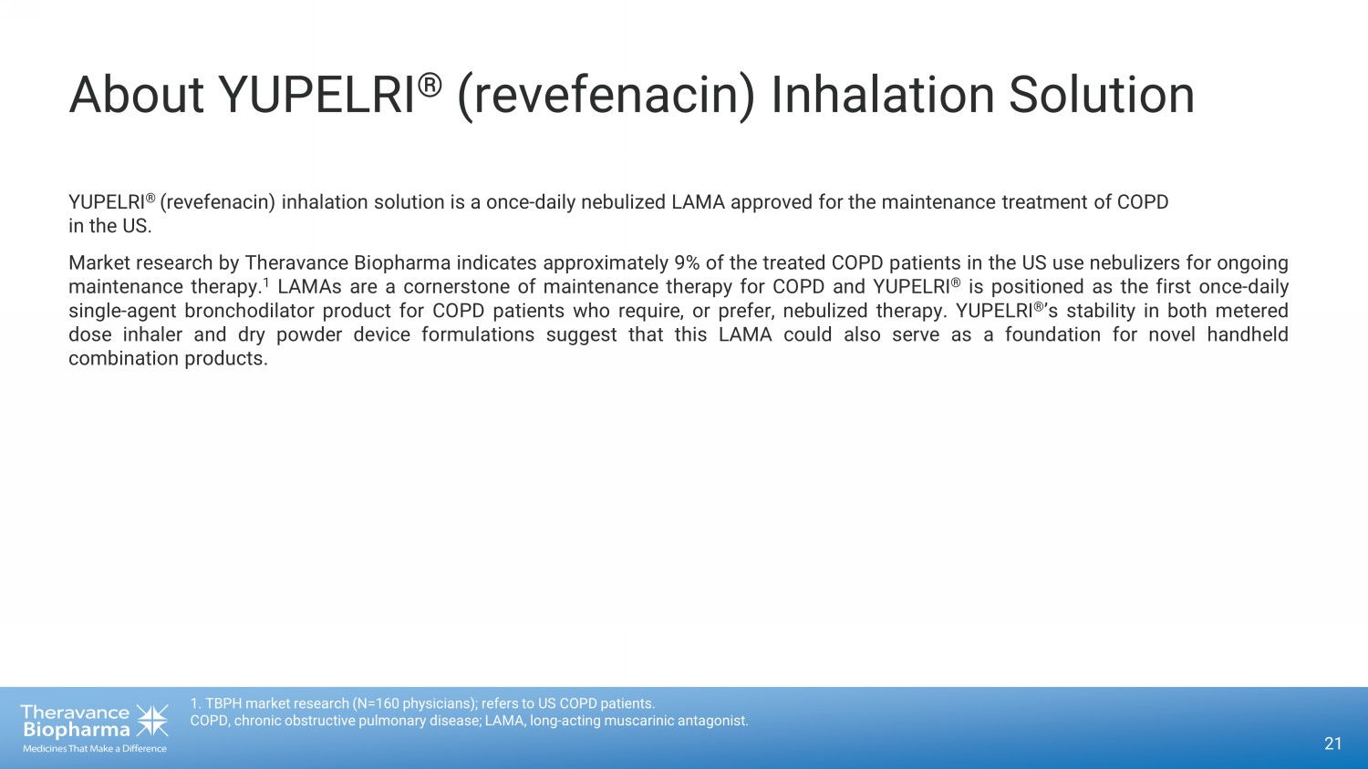About YUPELRI ® ( revefenacin ) Inhalation Solution YUPELRI ® ( revefenacin ) inhalation solution is a once - daily nebulized LAMA approved for the maintenance treatment of COPD in the US . Market research by Theravance Biopharma indicates approximately 9 % of the treated COPD patients in the US use nebulizers for ongoing maintenance therapy . 1 LAMAs are a cornerstone of maintenance therapy for COPD and YUPELRI ® is positioned as the first once - daily single - agent bronchodilator product for COPD patients who require, or prefer, nebulized therapy . YUPELRI ® ’s stability in both metered dose inhaler and dry powder device formulations suggest that this LAMA could also serve as a foundation for novel handheld combination products . 21 1. TBPH market research (N=160 physicians); refers to US COPD patients. COPD, chronic obstructive pulmonary disease; LAMA, long - acting muscarinic antagonist.