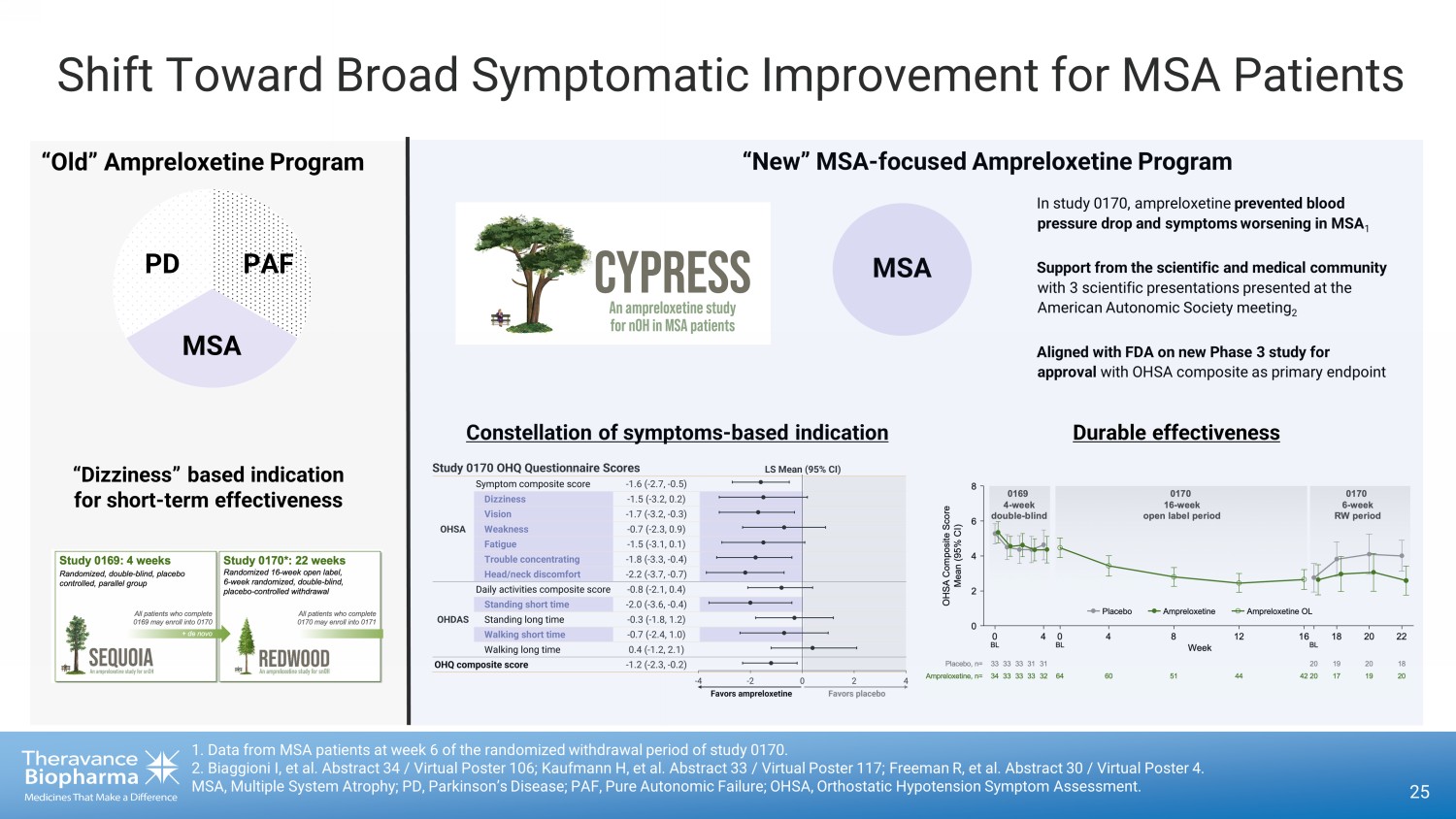 Droxidopa Midodrine Ampreloxetine 1 Indication Symptomatic nOH OH Symptomatic nOH associated with MSA MOA Norepinephrine prodrug; vasoconstrictor Desglymidodrine prodrug; alpha 1 - receptor agonist; vasoconstrictor Norepinephrine transporter reuptake inhibitor Dosing 3x daily, titration to effect 3x daily Once - daily Clinical Efficacy/ Durability OHSA#1, clinical effectiveness >2 weeks not established Increase in systolic blood pressure 1 min after standing OHSA composite; clinically meaningful and durable response over 22 weeks Clinical Safety Black box warning for supine hypertension No signal for supine hypertension in safety database of >800 patients and healthy subjects Offering Hope to MSA Patients with Symptomatic nOH Potential for ampreloxetine to differentiate from approved therapies 23 1. Reflects Theravance Biopharma's expectations for ampreloxetine based on clinical trial data to date. Ampreloxetine is in d eve lopment and not approved for any indication. Data on file. MOA, mechanism of action; MSA, multiple system atrophy; nOH , neurogenic orthostatic hypotension; OH, orthostatic hypotension; OHSA, orthostatic hypotension symptom assessment.