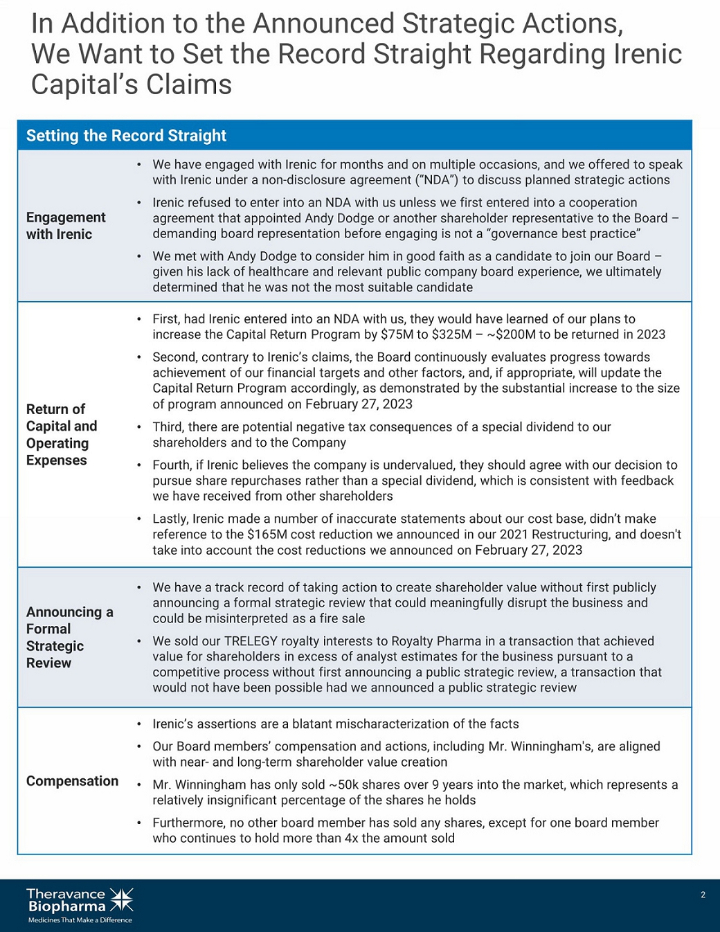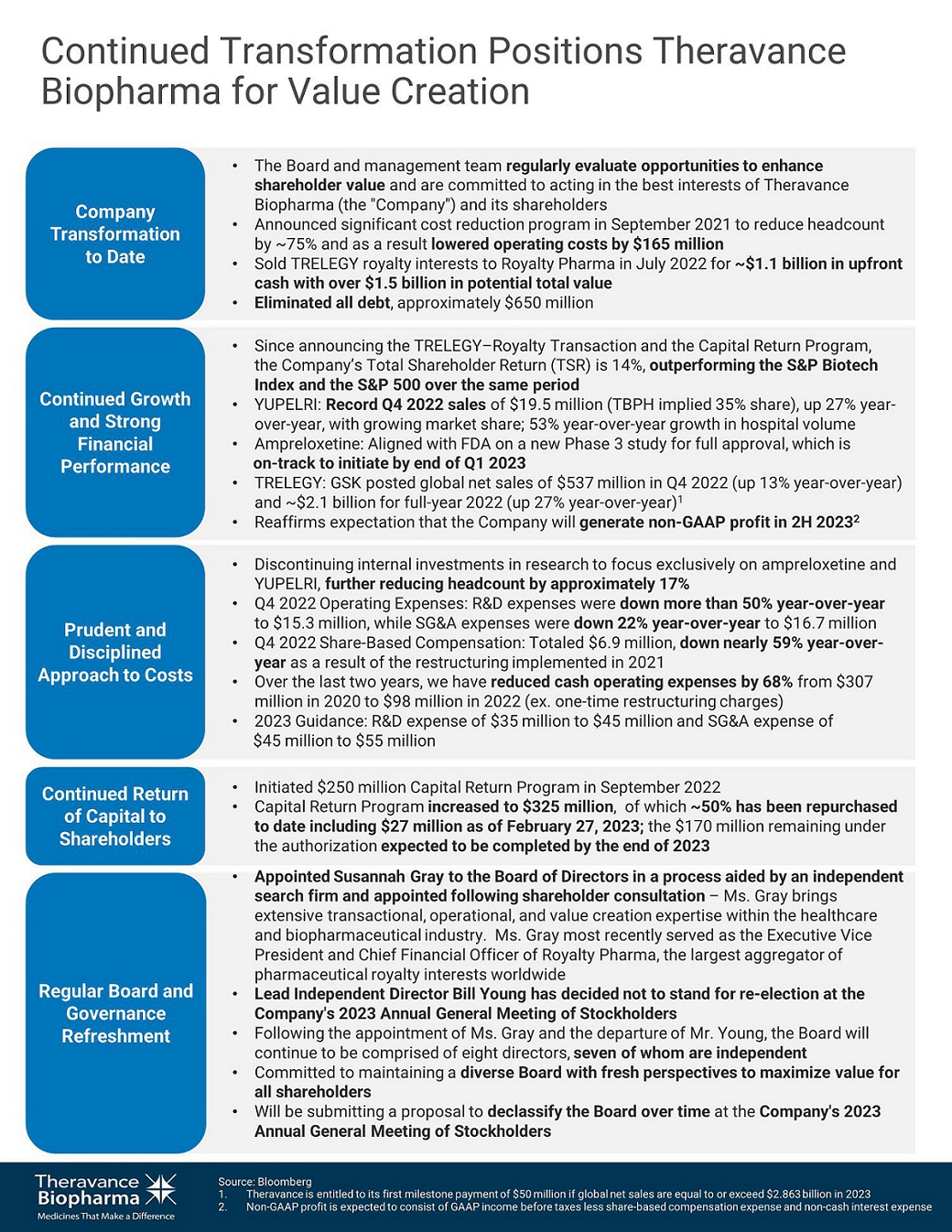 Continued Transformation Positions Theravance Biopharma for Value Creation • The Board and management team regularly evaluate opportunities to enhance shareholder value and are committed to acting in the best interests of Theravance Biopharma (the " Company ") and its shareholders • Announced significant cost reduction program in September 2021 to reduce headcount by ~75% and as a result lowered operating costs by $165 million • Sold TRELEGY royalty interests to Royalty Pharma in July 2022 for ~$1.1 billion in upfront cash with over $1.5 billion in potential total value • Eliminated all debt , approximately $650 million Company Transformation to Date • Since announcing the TRELEGY – Royalty Transaction and the Capital Return Program, the Company’s Total Shareholder Return (TSR) is 14%, outperforming the S&P Biotech Index and the S&P 500 over the same period • YUPELRI: Record Q4 2022 sales of $19.5 million (TBPH implied 35% share), up 27% year - over - year, with growing market share; 53% year - over - year growth in hospital volume • Ampreloxetine : Aligned with FDA on a new Phase 3 study for full approval, which is on - track to initiate by end of Q1 2023 • TRELEGY: GSK posted global net sales of $537 million in Q4 2022 (up 13% year - over - year) and ~$2.1 billion for full - year 2022 (up 27% year - over - year) 1 • Reaffirms expectation that the Company will generate non - GAAP profit in 2H 2023 2 Continued Growth and Strong Financial Performance • Discontinuing internal investments in research to focus exclusively on ampreloxetine and YUPELRI, further reducing headcount by approximately 17% • Q4 2022 Operating Expenses: R&D expenses were down more than 50% year - over - year to $15.3 million, while SG&A expenses were down 22% year - over - year to $16.7 million • Q4 2022 Share - Based Compensation: Totaled $6.9 million, down nearly 59% year - over - year as a result of the restructuring implemented in 2021 • Over the last two years, we have reduced cash operating expenses by 68% from $307 million in 2020 to $98 million in 2022 (ex. one - time restructuring charges) • 2023 Guidance: R&D expense of $35 million to $45 million and SG&A expense of $45 million to $55 million Prudent and Disciplined Approach to Costs • Initiated $250 million Capital Return Program in September 2022 • Capital Return Program increased to $325 million , of which ~50% has been repurchased to date including $27 million so far in 2023; the $170 million remaining under the authorization expected to be completed by the end of 2023 Continued Return of Capital to Shareholders • Appointed Susannah Gray to the Board of Directors in a process aided by an independent search firm and appointed following shareholder consultation – Ms. Gray brings extensive transactional, operational, and value creation expertise within the healthcare and biopharmaceutical industry. Ms. Gray most recently served as the Executive Vice President and Chief Financial Officer of Royalty Pharma, the largest aggregator of pharmaceutical royalty interests worldwide • Lead Independent Director Bill Young has decided not to stand for re - election at the Company's 2023 Annual General Meeting of Stockholders • Following the appointment of Ms. Gray and the departure of Mr. Young, the Board will continue to be comprised of eight directors, seven of whom are independent • Committed to maintaining a diverse Board with fresh perspectives to maximize value for all shareholders • Will be submitting a proposal to declassify the Board over time at the Company's 2023 Annual General Meeting of Stockholders Regular Board and Governance Refreshment Source: Bloomberg 1. Theravance is entitled to its first milestone payment of $50 million if global net sales are equal to or exceed $2.863 billion in 2023 2. Non - GAAP profit is expected to consist of GAAP income before taxes less share - based compensation expense and non - cash interest e xpense