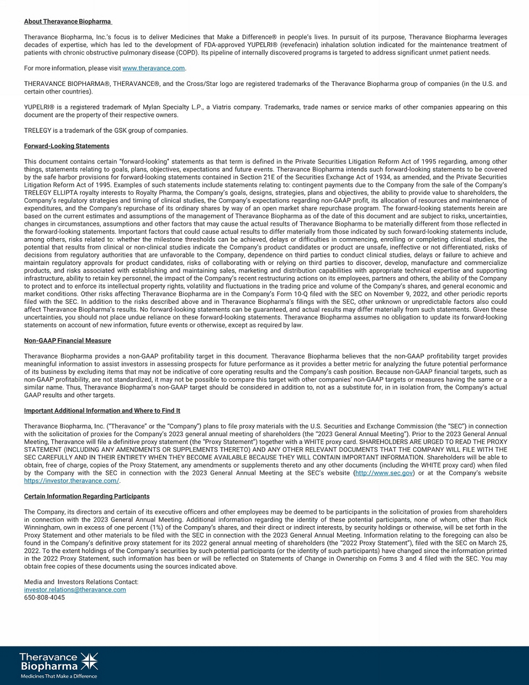 About Theravance Biopharma Theravance Biopharma, Inc . ’s focus is to deliver Medicines that Make a Difference® in people’s lives . In pursuit of its purpose, Theravance Biopharma leverages decades of expertise, which has led to the development of FDA - approved YUPELRI® ( revefenacin ) inhalation solution indicated for the maintenance treatment of patients with chronic obstructive pulmonary disease (COPD) . Its pipeline of internally discovered programs is targeted to address significant unmet patient needs . For more information, please visit www . theravance . com . THERAVANCE BIOPHARMA®, THERAVANCE®, and the Cross/Star logo are registered trademarks of the Theravance Biopharma group of companies (in the U . S . and certain other countries) . YUPELRI® is a registered trademark of Mylan Specialty L . P . , a Viatris company . Trademarks, trade names or service marks of other companies appearing on this document are the property of their respective owners . TRELEGY is a trademark of the GSK group of companies . Forward - Looking Statements This document contains certain “forward - looking” statements as that term is defined in the Private Securities Litigation Reform Act of 1995 regarding, among other things, statements relating to goals, plans, objectives, expectations and future events . Theravance Biopharma intends such forward - looking statements to be covered by the safe harbor provisions for forward - looking statements contained in Section 21 E of the Securities Exchange Act of 1934 , as amended, and the Private Securities Litigation Reform Act of 1995 . Examples of such statements include statements relating to : contingent payments due to the Company from the sale of the Company’s TRELEGY ELLIPTA royalty interests to Royalty Pharma, the Company’s goals, designs, strategies, plans and objectives, the ability to provide value to shareholders, the Company’s regulatory strategies and timing of clinical studies, the Company’s expectations regarding non - GAAP profit, its allocation of resources and maintenance of expenditures, and the Company’s repurchase of its ordinary shares by way of an open market share repurchase program . The forward - looking statements herein are based on the current estimates and assumptions of the management of Theravance Biopharma as of the date of this document and are subject to risks, uncertainties, changes in circumstances, assumptions and other factors that may cause the actual results of Theravance Biopharma to be materially different from those reflected in the forward - looking statements . Important factors that could cause actual results to differ materially from those indicated by such forward - looking statements include, among others, risks related to : whether the milestone thresholds can be achieved, delays or difficulties in commencing, enrolling or completing clinical studies, the potential that results from clinical or non - clinical studies indicate the Company’s product candidates or product are unsafe, ineffective or not differentiated, risks of decisions from regulatory authorities that are unfavorable to the Company, dependence on third parties to conduct clinical studies, delays or failure to achieve and maintain regulatory approvals for product candidates, risks of collaborating with or relying on third parties to discover, develop, manufacture and commercialize products, and risks associated with establishing and maintaining sales, marketing and distribution capabilities with appropriate technical expertise and supporting infrastructure, ability to retain key personnel, the impact of the Company’s recent restructuring actions on its employees, partners and others, the ability of the Company to protect and to enforce its intellectual property rights, volatility and fluctuations in the trading price and volume of the Company’s shares, and general economic and market conditions . Other risks affecting Theravance Biopharma are in the Company’s Form 10 - Q filed with the SEC on November 9 , 2022 , and other periodic reports filed with the SEC . In addition to the risks described above and in Theravance Biopharma’s filings with the SEC, other unknown or unpredictable factors also could affect Theravance Biopharma’s results . No forward - looking statements can be guaranteed, and actual results may differ materially from such statements . Given these uncertainties, you should not place undue reliance on these forward - looking statements . Theravance Biopharma assumes no obligation to update its forward - looking statements on account of new information, future events or otherwise, except as required by law . Non - GAAP Financial Measure Theravance Biopharma provides a non - GAAP profitability target in this document . Theravance Biopharma believes that the non - GAAP profitability target provides meaningful information to assist investors in assessing prospects for future performance as it provides a better metric for analyzing the future potential performance of its business by excluding items that may not be indicative of core operating results and the Company’s cash position . Because non - GAAP financial targets, such as non - GAAP profitability, are not standardized, it may not be possible to compare this target with other companies’ non - GAAP targets or measures having the same or a similar name . Thus, Theravance Biopharma’s non - GAAP target should be considered in addition to, not as a substitute for, in in isolation from, the Company’s actual GAAP results and other targets . Important Additional Information and Where to Find It Theravance Biopharma, Inc . (“ Theravance ” or the “Company”) plans to file proxy materials with the U . S . Securities and Exchange Commission (the “SEC”) in connection with the solicitation of proxies for the Company’s 2023 general annual meeting of shareholders (the “ 2023 General Annual Meeting”) . Prior to the 2023 General Annual Meet