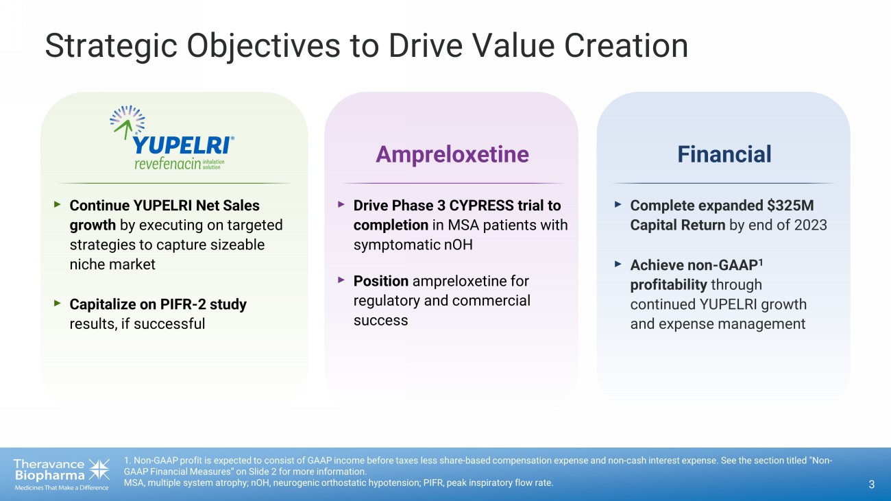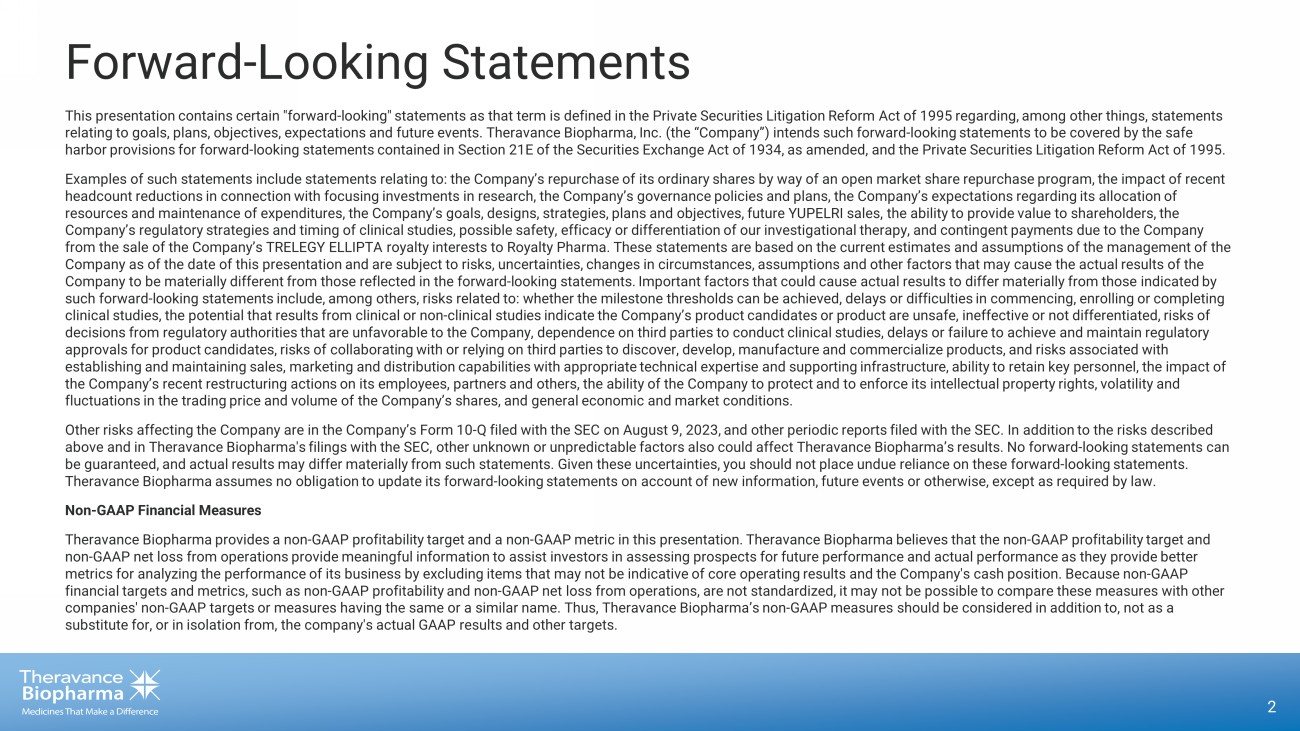 Forward - Looking Statements This presentation contains certain "forward - looking" statements as that term is defined in the Private Securities Litigation Ref orm Act of 1995 regarding, among other things, statements relating to goals, plans, objectives, expectations and future events. Theravance Biopharma, Inc. (the “Company”) intends such fo rward - looking statements to be covered by the safe harbor provisions for forward - looking statements contained in Section 21E of the Securities Exchange Act of 1934, as amended, an d the Private Securities Litigation Reform Act of 1995. Examples of such statements include statements relating to: the Company’s repurchase of its ordinary shares by way of an open ma rket share repurchase program, the impact of recent headcount reductions in connection with focusing investments in research, the Company’s governance policies and plans, the Co mpa ny’s expectations regarding its allocation of resources and maintenance of expenditures, the Company’s goals, designs, strategies, plans and objectives, future YUPELRI sal es, the ability to provide value to shareholders, the Company’s regulatory strategies and timing of clinical studies, possible safety, efficacy or differentiation of our investiga tio nal therapy, and contingent payments due to the Company from the sale of the Company’s TRELEGY ELLIPTA royalty interests to Royalty Pharma. These statements are based on the current es timates and assumptions of the management of the Company as of the date of this presentation and are subject to risks, uncertainties, changes in circumstances, assumptions an d o ther factors that may cause the actual results of the Company to be materially different from those reflected in the forward - looking statements. Important factors that could cause ac tual results to differ materially from those indicated by such forward - looking statements include, among others, risks related to: whether the milestone thresholds can be achieved, delay s or difficulties in commencing, enrolling or completing clinical studies, the potential that results from clinical or non - clinical studies indicate the Company’s product candidates or product are unsafe, ineffective or not differentiated, risks of decisions from regulatory authorities that are unfavorable to the Company, dependence on third parties to conduct clinical st udi es, delays or failure to achieve and maintain regulatory approvals for product candidates, risks of collaborating with or relying on third parties to discover, develop, manufacture a nd commercialize products, and risks associated with establishing and maintaining sales, marketing and distribution capabilities with appropriate technical expertise and supporti ng infrastructure, ability to retain key personnel, the impact of the Company’s recent restructuring actions on its employees, partners and others, the ability of the Company to protect and t o e nforce its intellectual property rights, volatility and fluctuations in the trading price and volume of the Company’s shares, and general economic and market conditions. Other risks affecting the Company are in the Company’s Form 10 - Q filed with the SEC on August 9, 2023, and other periodic report s filed with the SEC. In addition to the risks described above and in Theravance Biopharma's filings with the SEC, other unknown or unpredictable factors also could affect Theravance Bi opharma’s results. No forward - looking statements can be guaranteed, and actual results may differ materially from such statements. Given these uncertainties, you should not place un due reliance on these forward - looking statements. Theravance Biopharma assumes no obligation to update its forward - looking statements on account of new information, future events or otherwise, except as required by law. Non - GAAP Financial Measures Theravance Biopharma provides a non - GAAP profitability target and a non - GAAP metric in this presentation. Theravance Biopharma b elieves that the non - GAAP profitability target and non - GAAP net loss from operations provide meaningful information to assist investors in assessing prospects for future performan ce and actual performance as they provide better metrics for analyzing the performance of its business by excluding items that may not be indicative of core operating results an d the Company's cash position. Because non - GAAP financial targets and metrics, such as non - GAAP profitability and non - GAAP net loss from operations, are not standardized, it ma y not be possible to compare these measures with other companies' non - GAAP targets or measures having the same or a similar name. Thus, Theravance Biopharma’s non - GAAP measures should be considered in addition to, not as a substitute for, or in isolation from, the company's actual GAAP results and other targets. 2