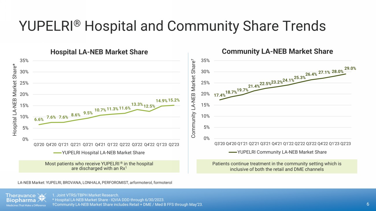 107,790 113,220 137,760 159,720 156,180 K 20 K 40 K 60 K 80 K 100 K 120 K 140 K 160 K 180 K Q2'22 Q3'22 Q4'22 Q1'23 Q2'23 $49.1 $53.4 $55.7 $47.0 $55.0 0 10 20 30 40 50 60 Q2'22 Q3'22 Q4'22 Q1'23 Q2'23 YUPELRI ® | Growing Net Sales and Hospital Volume 5 YUPELRI Hospital Doses Hospital doses sold increased 45% Q2’23 vs. Q2’22 2 Total YUPELRI Net Sales ($M) Net sales increased 12% Q2’23 vs. Q2’22 1 20% rolling 4 - quarter growth through Q2’23 50% rolling 4 - quarter growth through Q2’23 1. In the US, Viatris is leading the commercialization of YUPELRI, and Theravance Biopharma co - promotes the product under a prof it and loss sharing arrangement (65% to Viatris; 35% to Theravance Biopharma). 2. Source: IQVIA DDD, HDS, VA and Non - Reporting Hospital through 6/30/2023. Preliminary data subject to revision upon receipt of final data.