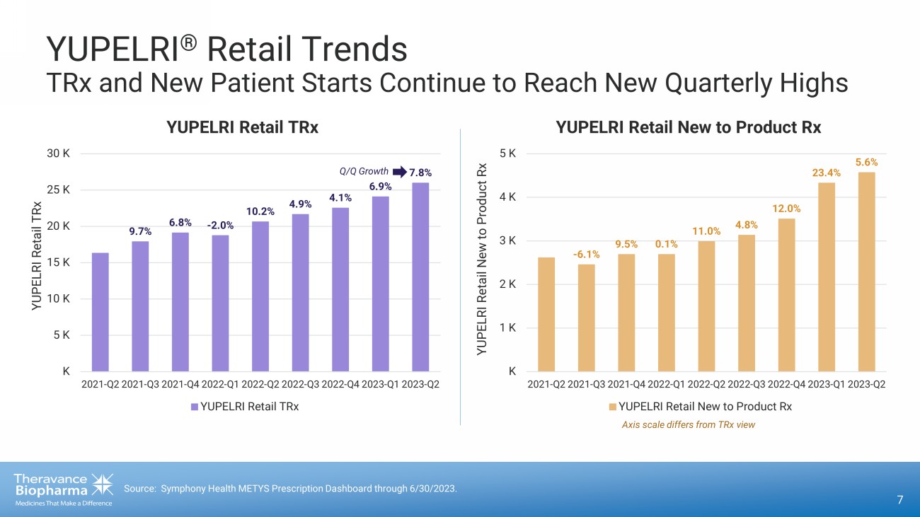 YUPELRI ® Hospital and Community Share Trends 6 1. Joint VTRS/TBPH Market Research. * Hospital LA - NEB Market Share - IQVIA DDD through 6/30/2023. †Community LA - NEB Market Share includes Retail + DME / Med B FFS through May’23. 6.6% 7.6% 7.6% 8.6% 9.5% 10.7% 11.3% 11.6% 13.3% 12.5% 14.9% 15.2% 0% 5% 10% 15% 20% 25% 30% 35% Q3'20 Q4'20 Q1'21 Q2'21 Q3'21 Q4'21 Q1'22 Q2'22 Q3'22 Q4'22 Q1'23 Q2'23 Hospital LA - NEB Market Share* YUPELRI Hospital LA-NEB Market Share Patients continue treatment in the community setting which is inclusive of both the retail and DME channels 17.4% 18.7% 19.7% 21.4% 22.5% 23.2% 24.1% 25.3% 26.4% 27.1% 28.0% 29.0% 0% 5% 10% 15% 20% 25% 30% 35% Q3'20 Q4'20 Q1'21 Q2'21 Q3'21 Q4'21 Q1'22 Q2'22 Q3'22 Q4'22 Q1'23 Q2'23 Community LA - NEB Market Share † YUPELRI Community LA-NEB Market Share Most patients who receive YUPELRI ® in the hospital are discharged with an Rx 1 LA - NEB Market: YUPELRI, BROVANA, LONHALA, PERFOROMIST, arformoterol, formoterol Hospital LA - NEB Market Share Community LA - NEB Market Share