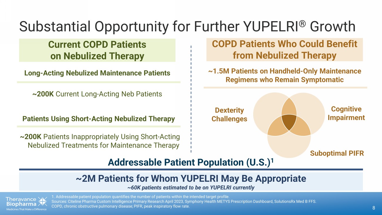7 Source: Symphony Health METYS Prescription Dashboard through 6/30/2023. ​ 9.7% 6.8% - 2.0% 10.2% 4.9% 4.1% 6.9% 7.8% K 5 K 10 K 15 K 20 K 25 K 30 K 2021-Q2 2021-Q3 2021-Q4 2022-Q1 2022-Q2 2022-Q3 2022-Q4 2023-Q1 2023-Q2 YUPELRI Retail TRx YUPELRI Retail TRx YUPELRI Retail TRx ​ - 6.1% 9.5% 0.1% 11.0% 4.8% 12.0% 23.4% 5.6% K 1 K 2 K 3 K 4 K 5 K 2021-Q2 2021-Q3 2021-Q4 2022-Q1 2022-Q2 2022-Q3 2022-Q4 2023-Q1 2023-Q2 YUPELRI Retail New to Product Rx YUPELRI Retail New to Product Rx YUPELRI Retail New to Product Rx Axis scale differs from TRx view YUPELRI ® Retail Trends TRx and New Patient Starts Continue to Reach New Quarterly Highs Q /Q Growth