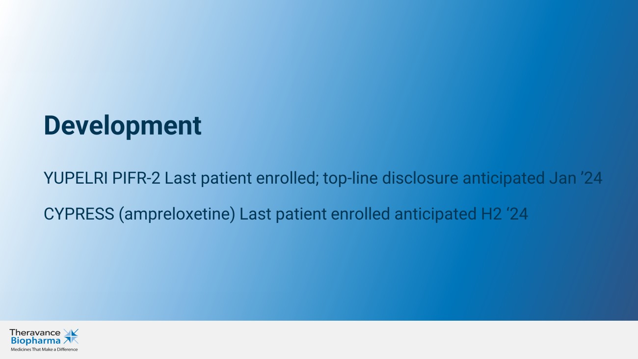 Development YUPELRI PIFR - 2 Last patient enrolled; top - line disclosure anticipated Jan ’24 CYPRESS ( ampreloxetine ) Last patient enrolled anticipated H2 ‘24