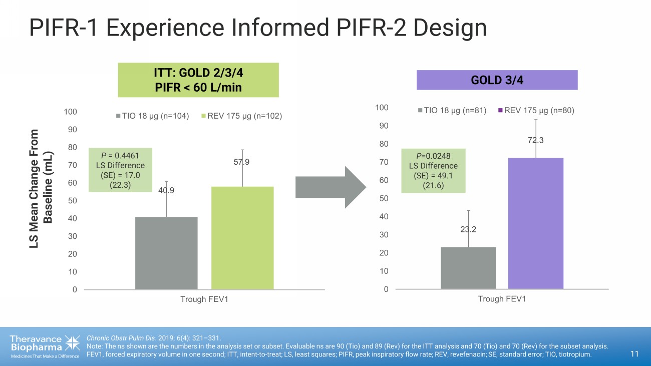PIFR - 1 Experience Informed PIFR - 2 Design Chronic Obstr Pulm Dis . 2019; 6(4): 321 – 331. Note: The ns shown are the numbers in the analysis set or subset. Evaluable ns are 90 (Tio) and 89 (Rev) for the ITT analysis an d 70 (Tio) and 70 (Rev) for the subset analysis. FEV1, forced expiratory volume in one second; ITT, intent - to - treat; LS, least squares; PIFR, peak inspiratory flow rate; REV, re vefenacin; SE, standard error; TIO, tiotropium. P = 0.4461 LS Difference (SE) = 17.0 (22.3) LS Mean Change From Baseline (mL) ITT: GOLD 2/3/4 PIFR < 60 L/min P =0.0248 LS Difference (SE) = 49.1 (21.6) GOLD 3/4 40.9 57.9 0 10 20 30 40 50 60 70 80 90 100 Trough FEV1 TIO 18 μ g (n=104) REV 175 μg (n=102) 23.2 72.3 0 10 20 30 40 50 60 70 80 90 100 Trough FEV1 TIO 18 μ g (n=81) REV 175 μg (n=80) 11