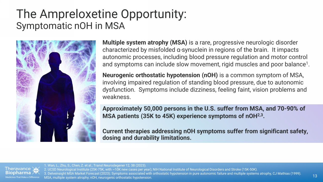 Ampreloxetine’s Significant Potential 20 Reflects Theravance Biopharma's expectations for ampreloxetine based on clinical trial data to date. Ampreloxetine is in deve lop ment and not approved for any indication. Data on file. 1. UCSD Neurological Institute (25K - 75K, with ~10K new cases per year); NIH National Institute of Neurological Disorders and Str oke (15K - 50K). 2. Delveinsight MSA Market Forecast (2023); Symptoms associated with orthostatic hypotension in pure autonomic failure and multiple systems atrophy, CJ Mathias (1999). 3 . N ORTHERA ® (droxidopa) [package insert]. Deerfield, IL: Lundbeck. 2014. 4. ProAmatine® (midodrine hydrochloride) [Warning Ref 4052798]. Lexington, MA: Shire. 2017. MSA, multiple system atrophy; nOH, neurogenic orthostatic hypotension; OHSA, Orthostatic Hypotension Symptom Assessment. ~50K MSA patients in U.S. 1 (orphan disease) MSA Prevalence 70% - 90% of MSA patients experience nOH symptoms 2 Prevalence of nOH in MSA Patients 35K – 45K MSA patients with nOH symptoms Addressable Patient Population • No approved therapy has demonstrated a durable effect on nOH symptoms 1,2 • In about half of patients with nOH, supine hypertension complicates management 3 • Many MSA patients remain inadequately managed for nOH symptoms, despite available therapies 4 • Long - term adherence remains low, despite genericization of approved treatments 4,5 • A chieve market leadership as the only treatment proven to deliver durable nOH symptom improvement in MSA patients as measured by OSHA Composite • Deliver considerable quality of life improvements to patients and caregivers • Improve rates of compliance and persistence within the treated population • Significantly expand the percentage of MSA patients treated for nOH symptoms Competitive Analysis: Ampreloxetine Should: