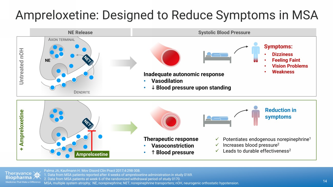 13 The Ampreloxetine Opportunity: Symptomatic nOH in MSA 1. Wan, L., Zhu, S., Chen, Z. et al., Transl Neurodegener 12, 38 (2023). 2. UCSD Neurological Institute (25K - 75K, with ~10K new cases per year); NIH National Institute of Neurological Disorders and Str oke (15K - 50K). 3. Delveinsight MSA Market Forecast (2023); Symptoms associated with orthostatic hypotension in pure autonomic failure and mu lti ple systems atrophy, CJ Mathias (1999). MSA, multiple system atrophy; nOH, neurogenic orthostatic hypotension. Multiple system atrophy (MSA) is a rare, progressive neurologic disorder characterized by misfolded α - synuclein in regions of the brain. It impacts autonomic processes, including blood pressure regulation and motor control and symptoms can include slow movement, rigid muscles and poor balance 1 . Neurogenic orthostatic hypotension (nOH) is a common symptom of MSA, involving impaired regulation of standing blood pressure, due to autonomic dysfunction. Symptoms include dizziness, feeling faint, vision problems and weakness. Approximately 50,000 persons in the U.S. suffer from MSA, and 70 - 90% of MSA patients (35K to 45K) experience symptoms of nOH 2,3 . Current therapies addressing nOH symptoms suffer from significant safety, dosing and durability limitations.