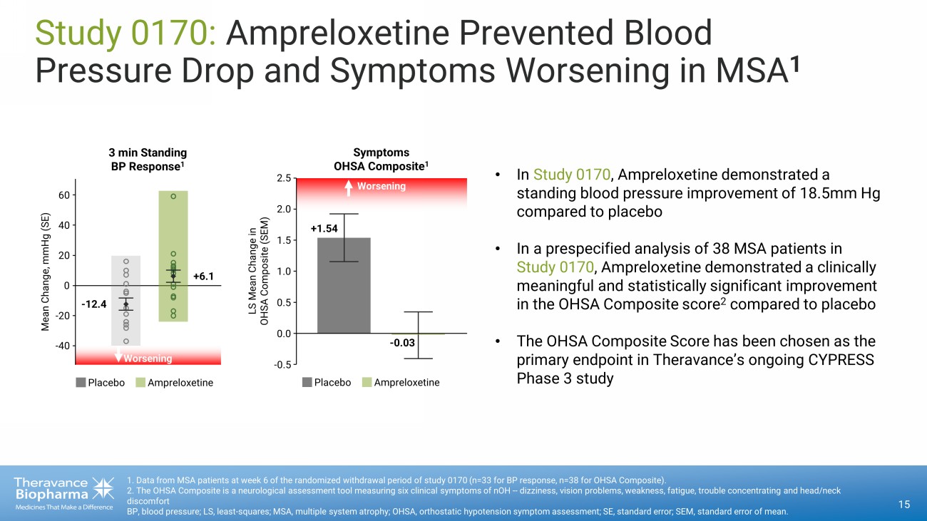 Untreated nOH NE Release Systolic Blood Pressure Ampreloxetine: Designed to Reduce Symptoms in MSA 14 Palma JA, Kaufmann H. Mov Disord Clin Pract 2017;4:298 - 308. 1. Data from MSA patients reported after 4 weeks of ampreloxetine administration in study 0169. 2. Data from MSA patients at week 6 of the randomized withdrawal period of study 0170. MSA, multiple system atrophy; NE, norepinephrine; NET, norepinephrine transporters; nOH, neurogenic orthostatic hypotension. Inadequate autonomic response • Vasodilation • Blood pressure upon standing Therapeutic response • Vasoconstriction • Blood pressure Symptoms: x Potentiates endogenous norepinephrine 1 x Increases blood pressure 2 x Leads to durable effectiveness 2 NE A XON TERMINAL D ENDRITE + Ampreloxetine Ampreloxetine Reduction in symptoms • Dizziness • Feeling Faint • Vision Problems • Weakness