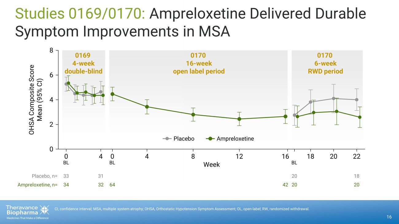 Study 0170: Ampreloxetine Prevented Blood Pressure Drop and Symptoms Worsening in MSA 1 15 1. Data from MSA patients at week 6 of the randomized withdrawal period of study 0170 (n=33 for BP response, n=38 for OHSA Co mpo site). 2. The OHSA Composite is a neurological assessment tool measuring six clinical symptoms of nOH -- dizziness, vision problems, we akness, fatigue, trouble concentrating and head/neck discomfort BP, blood pressure; LS, least - squares; MSA, multiple system atrophy; OHSA, orthostatic hypotension symptom assessment; SE, stand ard error; SEM, standard error of mean. 3 min Standing BP Response 1 - 40 - 20 0 20 40 60 Worsening - 12.4 +6.1 Mean Change, mmHg (SE) Placebo Ampreloxetine - 0.03 LS Mean Change in OHSA Composite (SEM) Worsening +1.54 Symptoms OHSA Composite 1 0.0 - 0.5 0.5 1.0 1.5 2.0 2.5 Placebo Ampreloxetine • In Study 0170 , Ampreloxetine demonstrated a standing blood pressure improvement of 18.5mm Hg compared to placebo • In a prespecifie d analysis of 38 MSA patients in Study 0170 , Ampreloxetine demonstrated a clinically meaningful and statistically significant improvement in the OHSA Composite score 2 compared to placebo • The OHSA Composite Score has been chosen as the primary endpoint in Theravance’s ongoing CYPRESS Phase 3 study