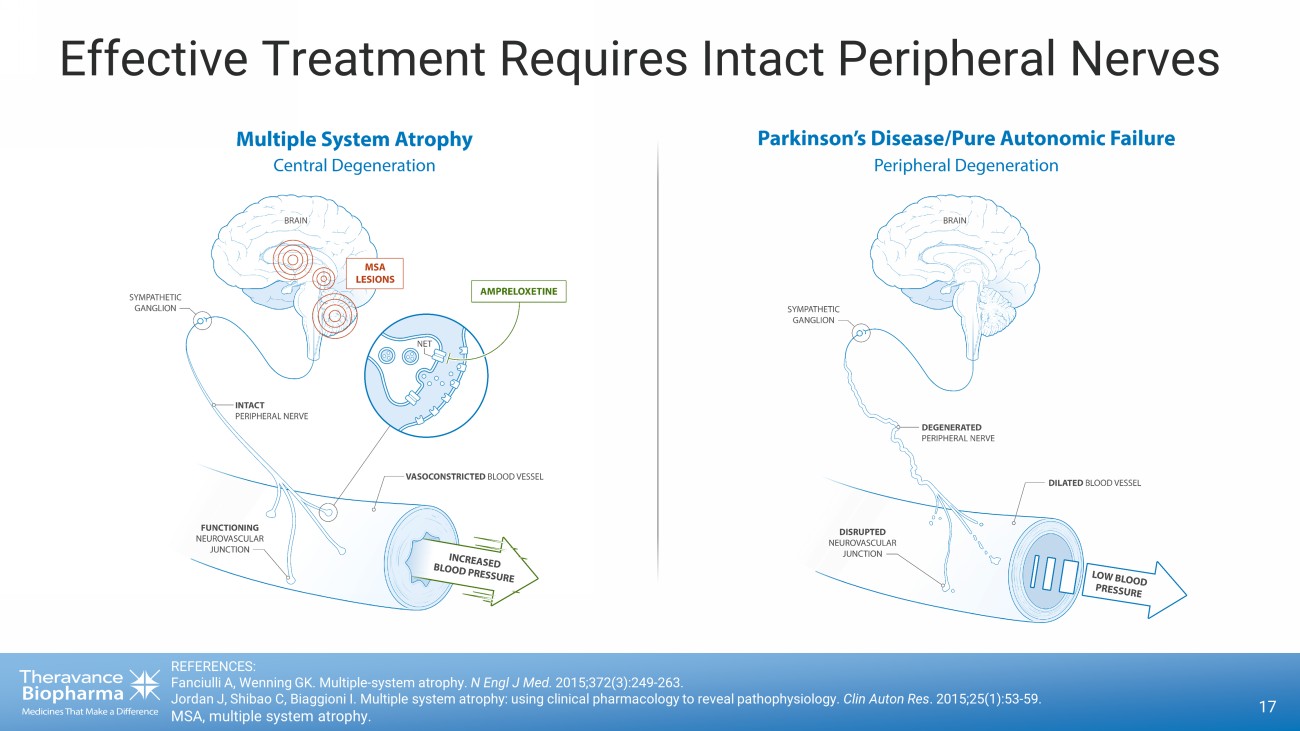 17 Effective Treatment Requires Intact Peripheral Nerves REFERENCES: Fanciulli A, Wenning GK. Multiple - system atrophy. N Engl J Med. 2015;372(3):249 - 263. Jordan J, Shibao C, Biaggioni I. Multiple system atrophy: using clinical pharmacology to reveal pathophysiology. Clin Auton Res . 2015;25(1):53 - 59. MSA, multiple system atrophy.
