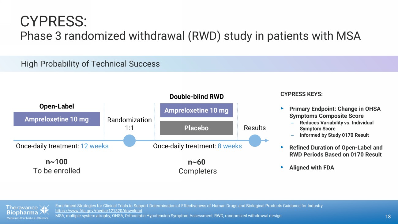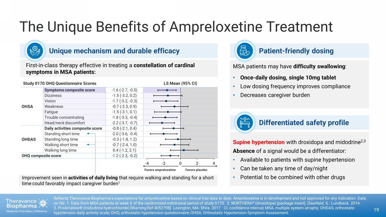High Probability of Technical Success CYPRESS: Phase 3 randomized withdrawal (RWD) study in patients with MSA 18 Enrichment Strategies for Clinical Trials to Support Determination of Effectiveness of Human Drugs and Biological Products Gu ida nce for Industry https://www.fda.gov/media/121320/download MSA, multiple system atrophy; OHSA, Orthostatic Hypotension Symptom Assessment; RWD, randomized withdrawal design. CYPRESS KEYS: ‣ Primary Endpoint: Change in OHSA Symptoms Composite Score – Reduces Variability vs. Individual Symptom Score – Informed by Study 0170 Result ‣ Refined D uration of Ope n - Label and RWD Periods Based on 0170 Result ‣ Aligned with FDA Randomization 1:1 Results Ampreloxetine 10 mg Placebo Once - daily treatment: 8 weeks Ampreloxetine 10 mg Open - Label Once - daily treatment: 12 weeks Double - blind RWD n~100 To be enrolled n~60 Completers