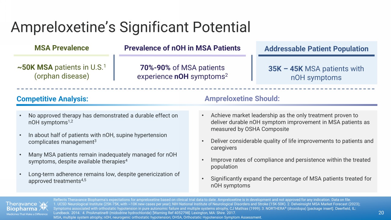 Study 0170 OHQ Questionnaire Scores LS Mean (95% CI) OHSA Symptoms composite score - 1.6 ( - 2.7, - 0.5) Dizziness - 1.5 ( - 3.2, 0.2) Vision - 1.7 ( - 3.2, - 0.3) Weakness - 0.7 ( - 2.3, 0.9) Fatigue - 1.5 ( - 3.1, 0.1) Trouble concentrating - 1.8 ( - 3.3, - 0.4) Head/neck discomfort - 2.2 ( - 3.7, - 0.7) OHDAS Daily activities composite score - 0.8 ( - 2.1, 0.4) Standing short time - 2.0 ( - 3.6, - 0.4) Standing long time - 0.3 ( - 1.8, 1.2) Walking short time - 0.7 ( - 2.4, 1.0) Walking long time 0.4 ( - 1.2, 2.1) OHQ composite score - 1.2 ( - 2.3, - 0.2) The Unique Benefits of Ampreloxetine Treatment 19 Reflects Theravance Biopharma's expectations for ampreloxetine based on clinical trial data to date. Ampreloxetine is in deve lop ment and not approved for any indication. Data on file. 1. Data from MSA patients at week 6 of the randomized withdrawal period of study 0170. 2. NORTHERA ® (droxidopa) [package insert]. Deerfield, IL: Lundbeck. 2014. 3. ProAmatine® (midodrine hydrochloride) [Warning Ref 4052798]. Lexington, MA: Shire. 2017. CI, confidence interval; MSA, multiple system atrophy; OHDAS, orthostatic hypotension daily activity scale; OHQ, orthostatic hypotension questionnaire; OHSA, Orthostatic Hypotension Symptom Assessmen t. Supine hypertension with droxidopa and midodrine 2,3 Absence of a signal would be a differentiator: • Available to patients with supine hypertension • Can be taken any time of day/night • Potential to be combined with other drugs Differentiated safety profile Unique mechanism and durable efficacy MSA patients may have difficulty swallowing : • Once - daily dosing, single 10mg tablet • Low dosing frequency improves compliance • Decreases caregiver burden Patient - friendly dosing First - in - class therapy effective in treating a constellation of cardinal symptoms in MSA patients: -4 -2 0 2 4 Favors ampreloxetine Favors placebo Improvement seen in activities of daily living that require w alking and standing for a short time could favorably impact caregiver burden 1