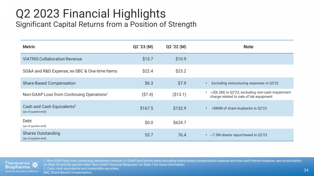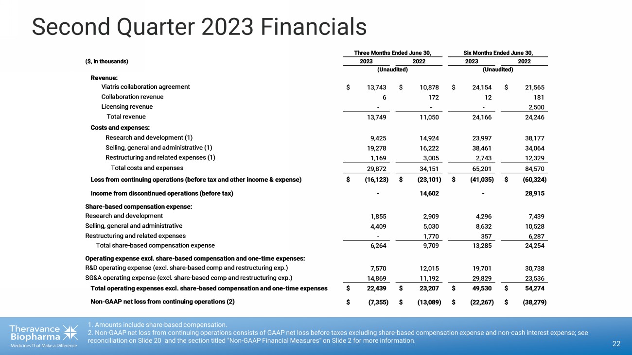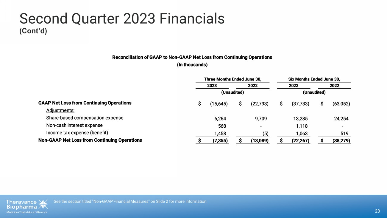 Second Quarter 2023 Financials 22 1. Amounts include share - based compensation. 2. Non - GAAP net loss from continuing operations consists of GAAP net loss before taxes excluding share - based compensation expens e and non - cash interest expense; see reconciliation on Slide 20 and the section titled "Non - GAAP Financial Measures“ on Slide 2 for more information. ($, in thousands) Revenue: Viatris collaboration agreement $ 13,743 $ 10,878 $ 24,154 $ 21,565 Collaboration revenue 6 172 12 181 Licensing revenue - - - 2,500 Total revenue 13,749 11,050 24,166 24,246 Costs and expenses: Research and development (1) 9,425 14,924 23,997 38,177 Selling, general and administrative (1) 19,278 16,222 38,461 34,064 Restructuring and related expenses (1) 1,169 3,005 2,743 12,329 Total costs and expenses 29,872 34,151 65,201 84,570 Loss from continuing operations (before tax and other income & expense) $ (16,123) $ (23,101) $ (41,035) $ (60,324) Income from discontinued operations (before tax) - 14,602 - 28,915 Share-based compensation expense: Research and development 1,855 2,909 4,296 7,439 Selling, general and administrative 4,409 5,030 8,632 10,528 Restructuring and related expenses - 1,770 357 6,287 Total share-based compensation expense 6,264 9,709 13,285 24,254 Operating expense excl. share-based compensation and one-time expenses: R&D operating expense (excl. share-based comp and restructuring exp.) 7,570 12,015 19,701 30,738 SG&A operating expense (excl. share-based comp and restructuring exp.) 14,869 11,192 29,829 23,536 Total operating expenses excl. share-based compensation and one-time expenses$ 22,439 $ 23,207 $ 49,530 $ 54,274 Non-GAAP net loss from continuing operations (2) $ (7,355) $ (13,089) $ (22,267) $ (38,279) Three Months Ended June 30, 2023 2022 (Unaudited) Six Months Ended June 30, 2023 2022 (Unaudited)