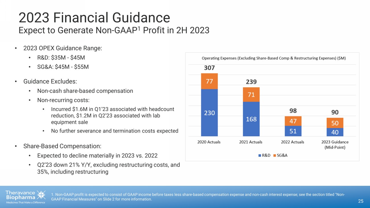 Q2 2023 Financial Highlights Significant Capital Returns from a Position of Strength 24 1. Non - GAAP loss from continuing operations consists of GAAP loss before taxes excluding share - based compensation expense and no n - cash interest expense; see reconciliation on Slide 20 and the section titled "Non - GAAP Financial Measures“ on Slide 2 for more information. 2. Cash, cash equivalents and marketable securities. SBC, Share - Based Compensation. Metric Q2 ‘23 (M) Q2 ’22 (M) Note VIATRIS Collaboration Revenue $13.7 $10.9 SG&A and R&D Expense, ex - SBC & One - time Items $22.4 $23.2 Share - Based Compensation $6.3 $7.9 • Excluding restructuring expenses in Q3’22 Non - GAAP Loss from Continuing Operations 1 ($7.4) ($13.1) • ~($6.2M) in Q2’23, excluding non - cash impairment charge related to sale of lab equipment Cash and Cash Equivalents 2 (as of quarter - end) $167.5 $132.9 • >$80M of share buybacks in Q2’23 Debt (as of quarter - end) $0.0 $624.7 Shares Outstanding (as of quarter - end) 53.7 76.4 • ~7.3M shares repurchased in Q2’23