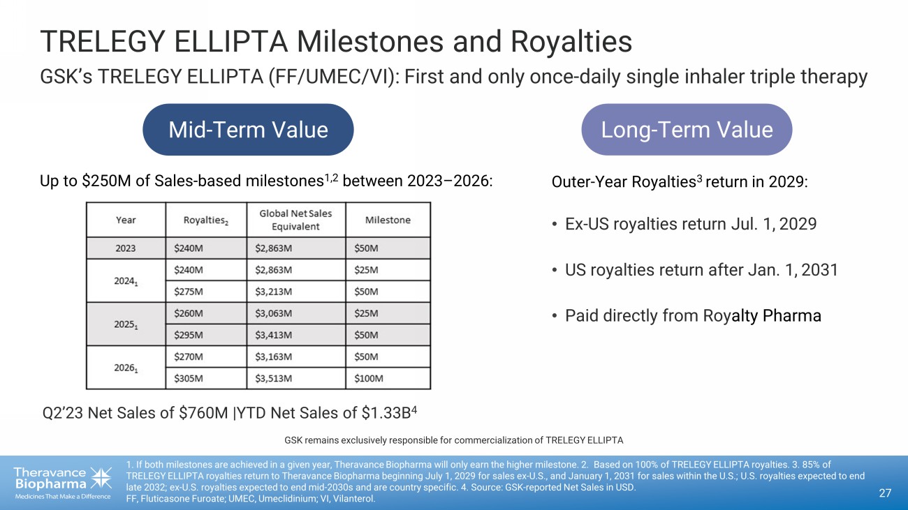 x ~$95M: Purchased GSK's equity stake in Theravance (Sep’22) and completed Dutch auction tender offer (Nov’22) x >$80M completed in Q2 2023 $325 Million Capital Return Program On Track to Complete Program by Year - End 26 Complete ($95M) Open Market Share Buybacks Complete ($169M) At 6/30/23: ~$264M completed overall; ~$61M remaining in capital return program
