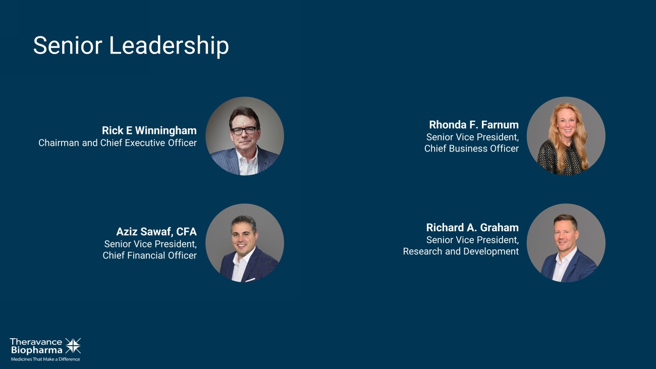 Rick E Winningham Chairman and Chief Executive Officer Aziz Sawaf, CFA Senior Vice President, Chief Financial Officer Rhonda F. Farnum Senior Vice President, Chief Business Officer Richard A. Graham Senior Vice President, Research and Development Senior Leadership