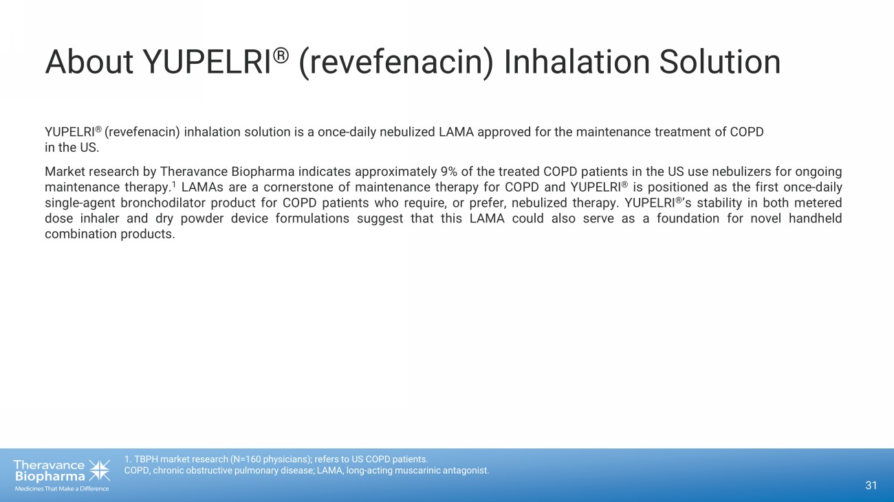 About YUPELRI ® (revefenacin) Inhalation Solution YUPELRI ® (revefenacin) inhalation solution is a once - daily nebulized LAMA approved for the maintenance treatment of COPD in the US . Market research by Theravance Biopharma indicates approximately 9 % of the treated COPD patients in the US use nebulizers for ongoing maintenance therapy . 1 LAMAs are a cornerstone of maintenance therapy for COPD and YUPELRI ® is positioned as the first once - daily single - agent bronchodilator product for COPD patients who require, or prefer, nebulized therapy . YUPELRI ® ’s stability in both metered dose inhaler and dry powder device formulations suggest that this LAMA could also serve as a foundation for novel handheld combination products . 31 1. TBPH market research (N=160 physicians); refers to US COPD patients. COPD, chronic obstructive pulmonary disease; LAMA, long - acting muscarinic antagonist.