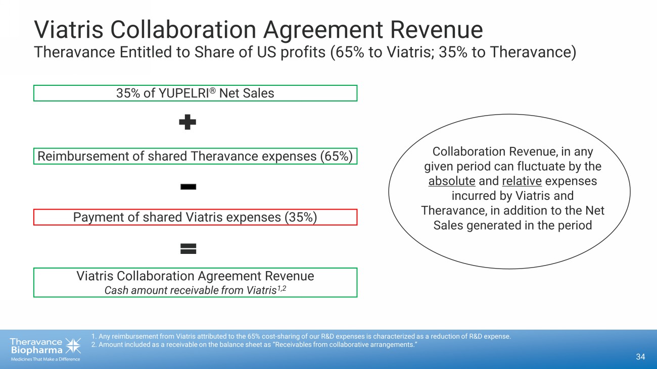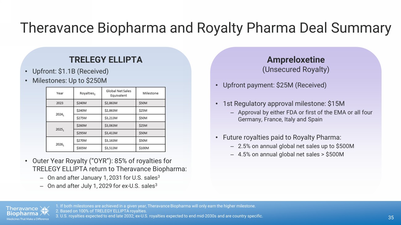 34 Viatris Collaboration Agreement Revenue Theravance Entitled to Share of US profits (65% to Viatris; 35% to Theravance) 1. Any reimbursement from Viatris attributed to the 65% cost - sharing of our R&D expenses is characterized as a reduction of R&D expense. 2. Amount included as a receivable on the balance sheet as “Receivables from collaborative arrangements.” Viatris Collaboration Agreement Revenue Cash amount receivable from Viatris 1,2 Payment of shared Viatris expenses (35%) Reimbursement of shared Theravance expenses (65%) 35% of YUPELRI ® Net Sales Collaboration Revenue, in any given period can fluctuate by the absolute and relative expenses incurred by Viatris and Theravance, in addition to the Net Sales generated in the period
