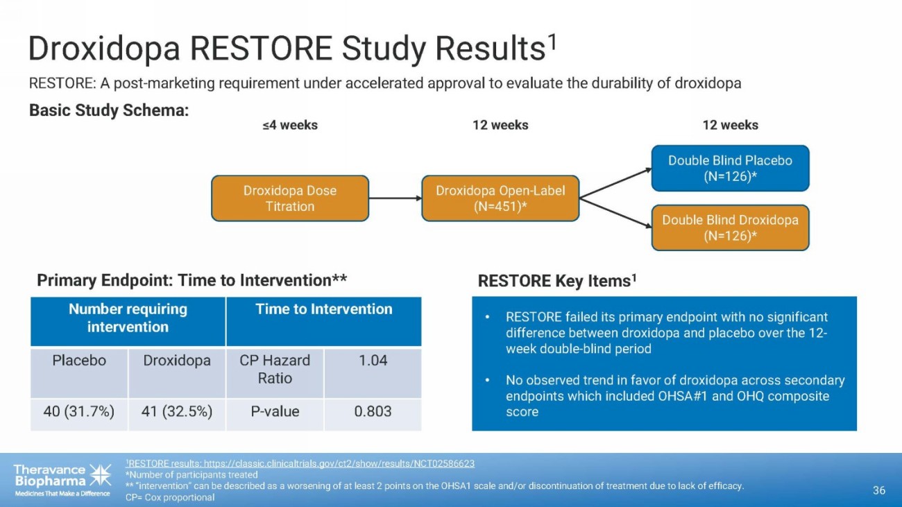 TRELEGY ELLIPTA Theravance Biopharma and Royalty Pharma Deal Summary • Upfront: $1.1B (Received) • Milestones: Up to $250M 35 1. If both milestones are achieved in a given year, Theravance Biopharma will only earn the higher milestone. 2. Based on 100% of TRELEGY ELLIPTA royalties. 3. U.S. royalties expected to end late 2032; ex - U.S. royalties expected to end mid - 2030s and are country specific. Ampreloxetine (Unsecured Royalty) • Outer Year Royalty (“OYR”): 85% of royalties for TRELEGY ELLIPTA return to Theravance Biopharma: – On and after January 1, ௗ 2031 ௗ for U.S. sales 3 – On and after July 1, ௗ 2029 ௗ for ex - U.S. sales 3 • Upfront payment: $25M (Received) • 1st Regulatory approval milestone: $15M – Approval by either FDA or first of the EMA or all four Germany, France, Italy and Spain • Future royalties paid to Royalty Pharma: – 2.5% on annual global net sales up to $500M – 4.5% on annual global net sales > $500M
