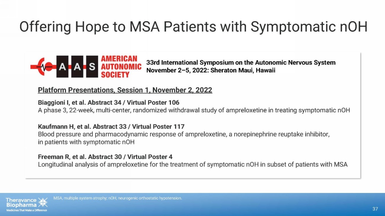 Offering Hope to MSA Patients with Symptomatic nOH 36 MSA, multiple system atrophy; nOH, neurogenic orthostatic hypotension. 33rd International Symposium on the Autonomic Nervous System November 2 – 5, 2022: Sheraton Maui , Hawaii Kaufmann H, et al. Abstract 33 / Virtual Poster 117 Blood pressure and pharmacodynamic response of ampreloxetine, a norepinephrine reuptake inhibitor, in patients with symptomatic nOH Biaggioni I, et al. Abstract 34 / Virtual Poster 106 A phase 3, 22 - week, multi - center, randomized withdrawal study of ampreloxetine in treating symptomatic nOH Freeman R, et al. Abstract 30 / Virtual Poster 4 Longitudinal analysis of ampreloxetine for the treatment of symptomatic nOH in subset of patients with MSA Platform Presentations, Session 1, November 2, 2022