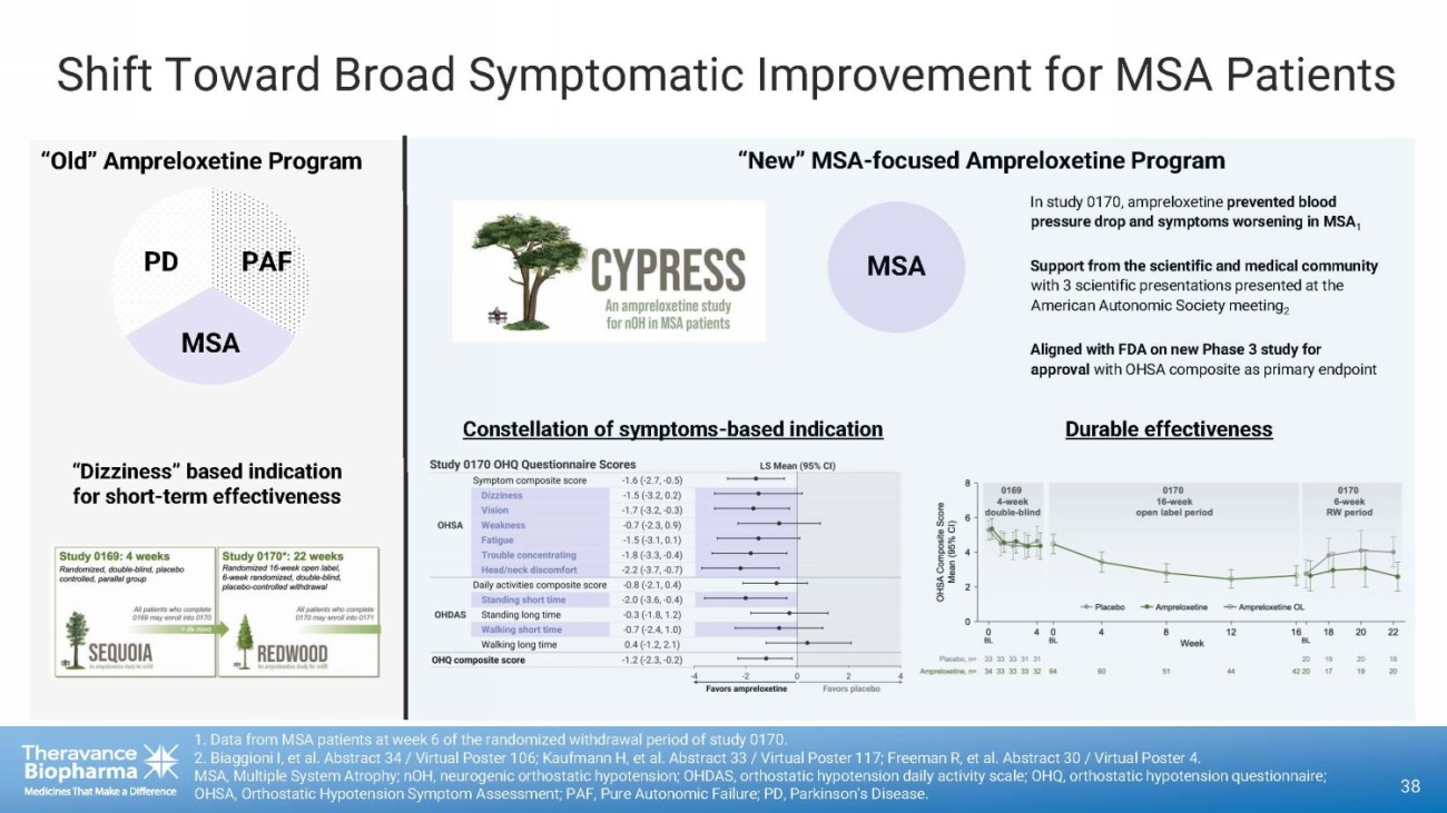 Shift Toward Broad Symptomatic Improvement for MSA Patients 1. Data from MSA patients at week 6 of the randomized withdrawal period of study 0170. 2. Biaggioni I, et al. Abstract 34 / Virtual Poster 106; Kaufmann H, et al. Abstract 33 / Virtual Poster 117; Freeman R, et al. Abstract 30 / Virtual Poster 4. MSA, Multiple System Atrophy; nOH, neurogenic orthostatic hypotension; OHDAS, orthostatic hypotension daily activity scale; OHQ, orthostatic hypotension questionnaire; OHSA, Orthostatic Hypotension Symptom Assessment ; PAF, Pure Autonomic Failure; PD, Parkinson’s Disease. “Old” Ampreloxetine Program “New” MSA - focused Ampreloxetine Program MSA PAF MSA PD “Dizziness” based indication for short - term effectiveness Constellation of symptoms - based indication In study 0170, ampreloxetine prevented blood pressure drop and symptoms worsening in MSA 1 Support from the scientific and medical community with 3 scientific presentations presented at the American Autonomic Society meeting 2 Aligned with FDA on new Phase 3 study for approval with OHSA composite as primary endpoint Durable effectiveness 37