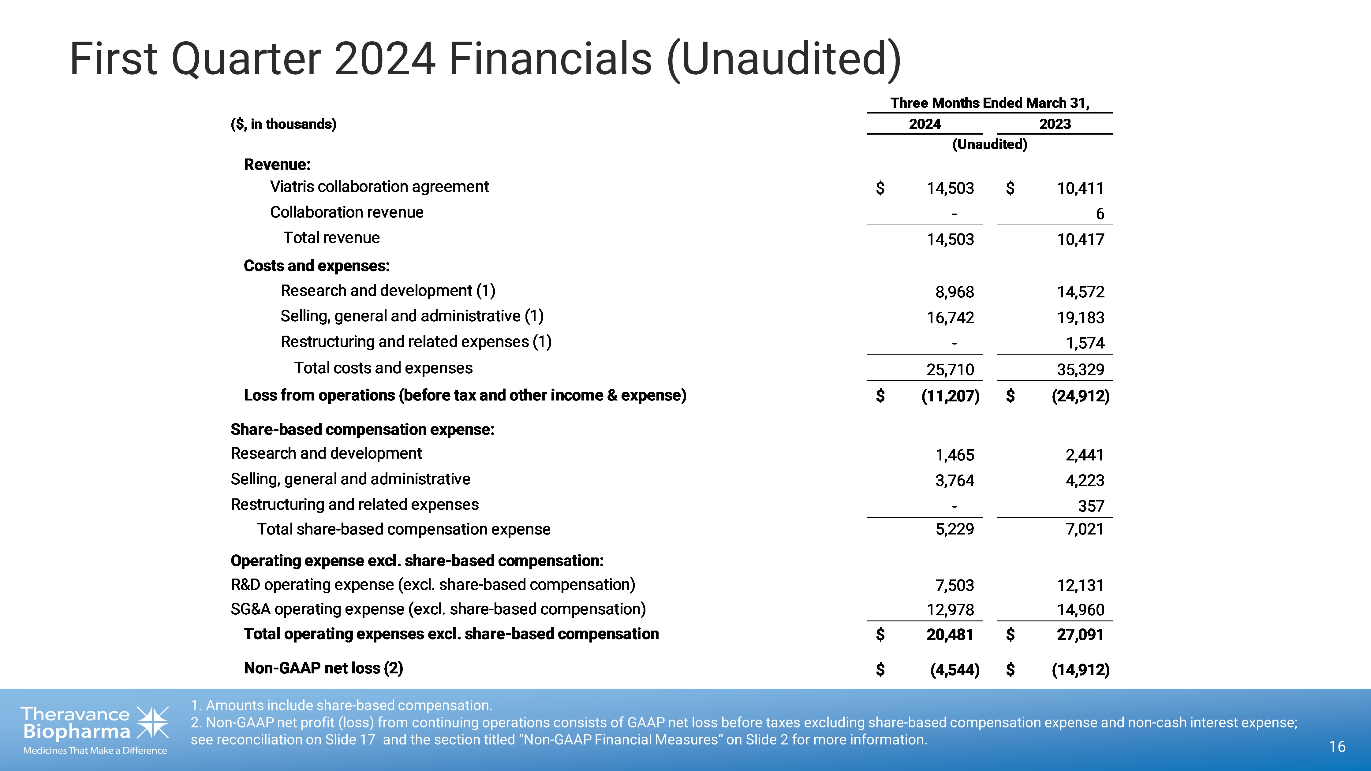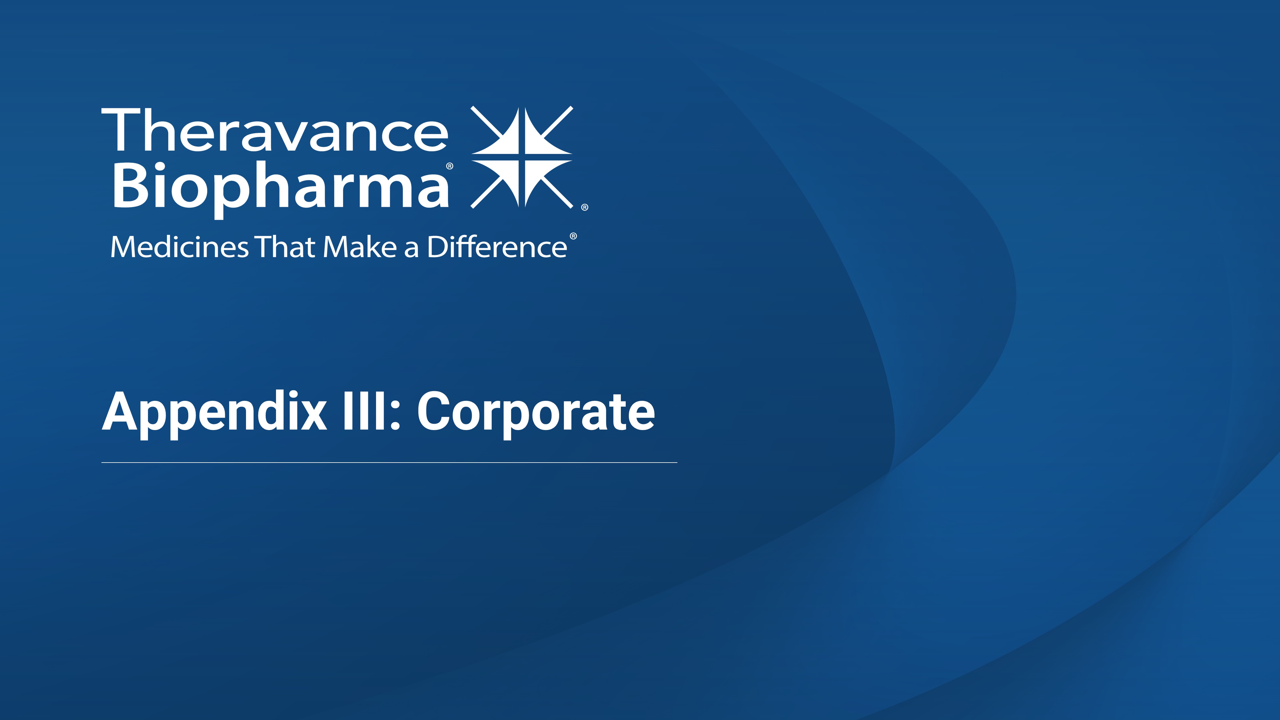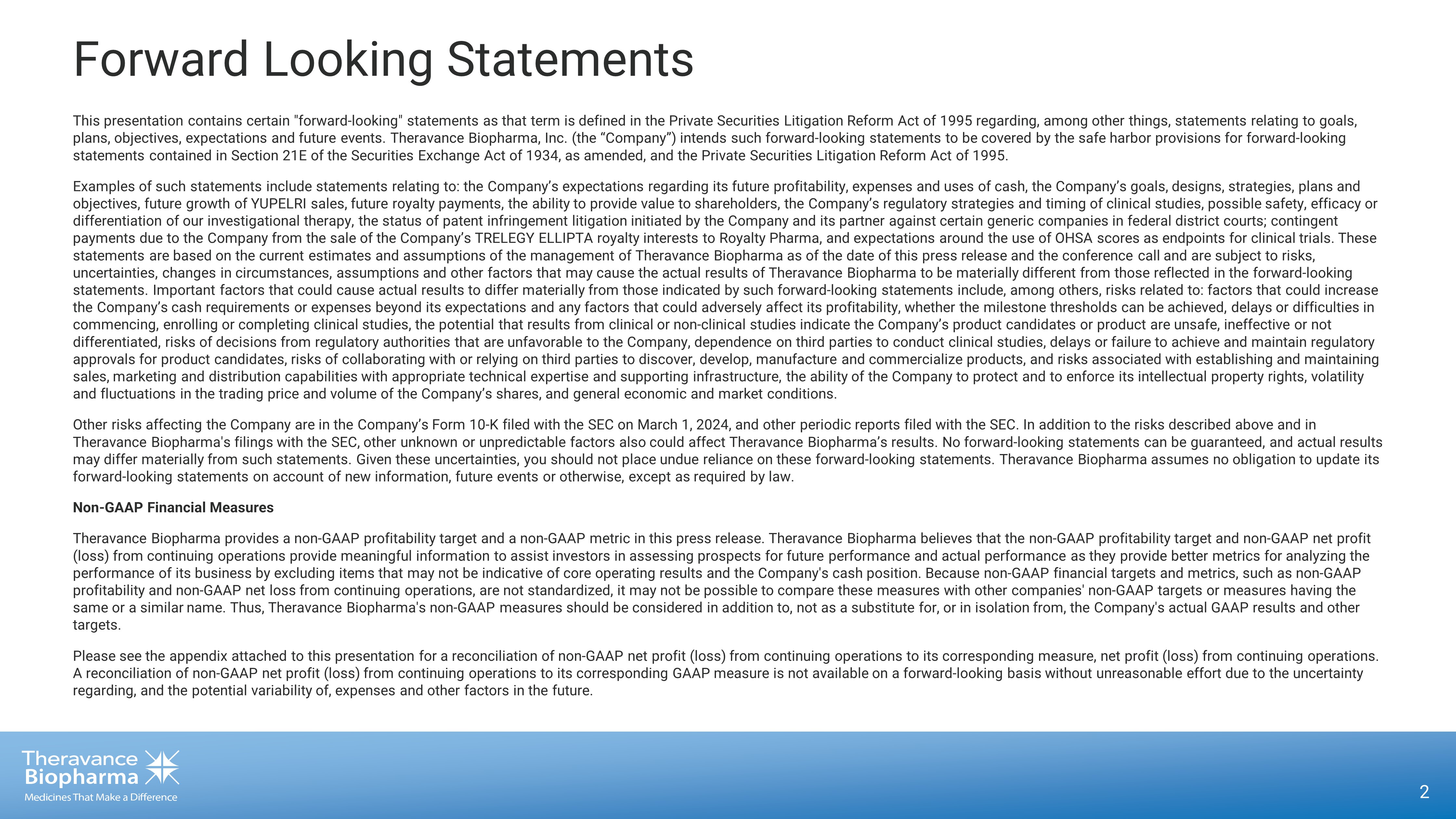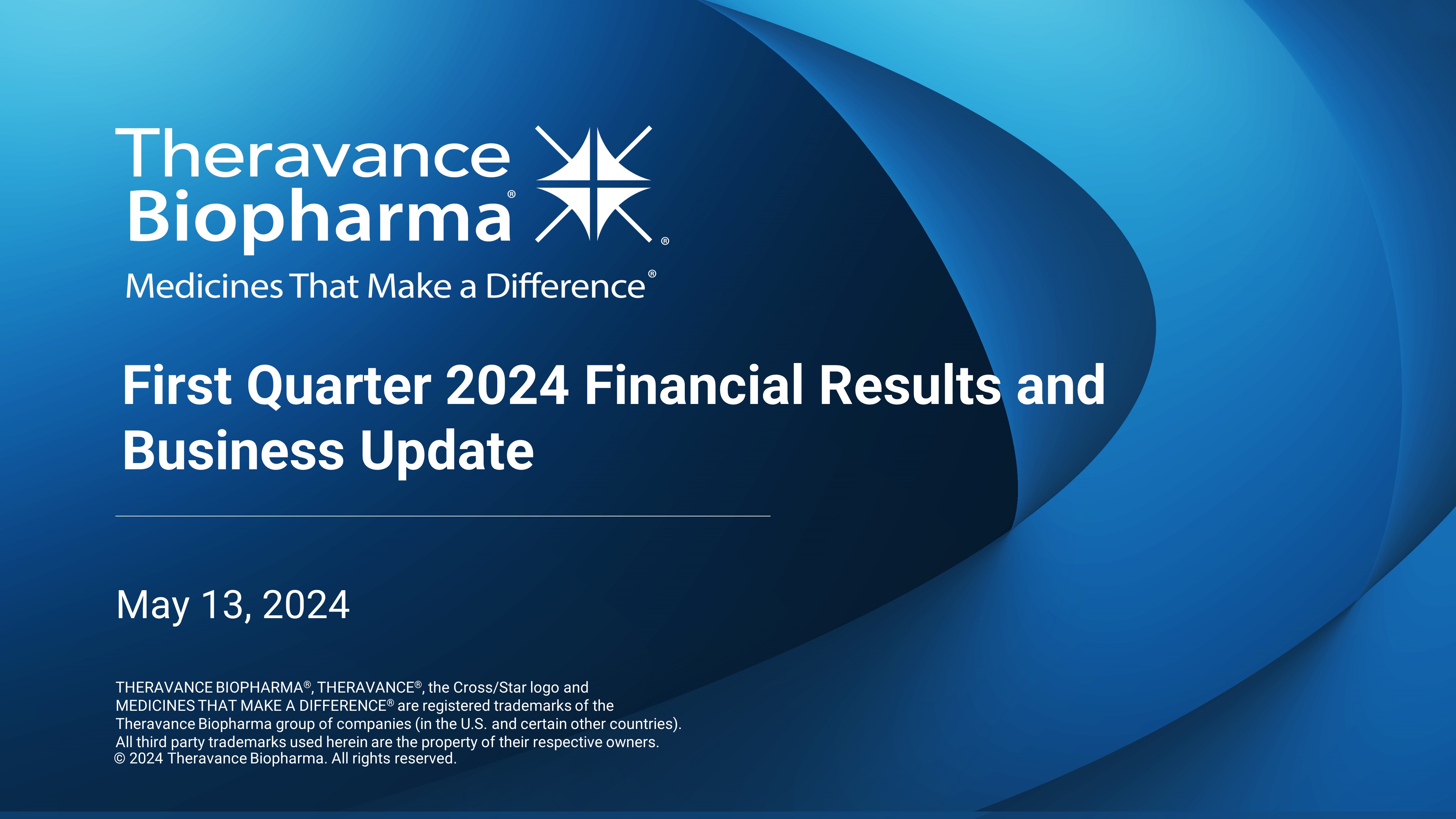 THERAVANCE BIOPHARMA ® , THERAVANCE ® , the Cross/Star logo and MEDICINES THAT MAKE A DIFFERENCE ® are registered trademarks of the Theravance Biopharma group of companies (in the U.S. and certain other countries). All third party trademarks used herein are the property of their respective owners. First Quarter 2024 Financial Results and Business Update May 13 , 2024 © 2024 Theravance Biopharma. All rights reserved.