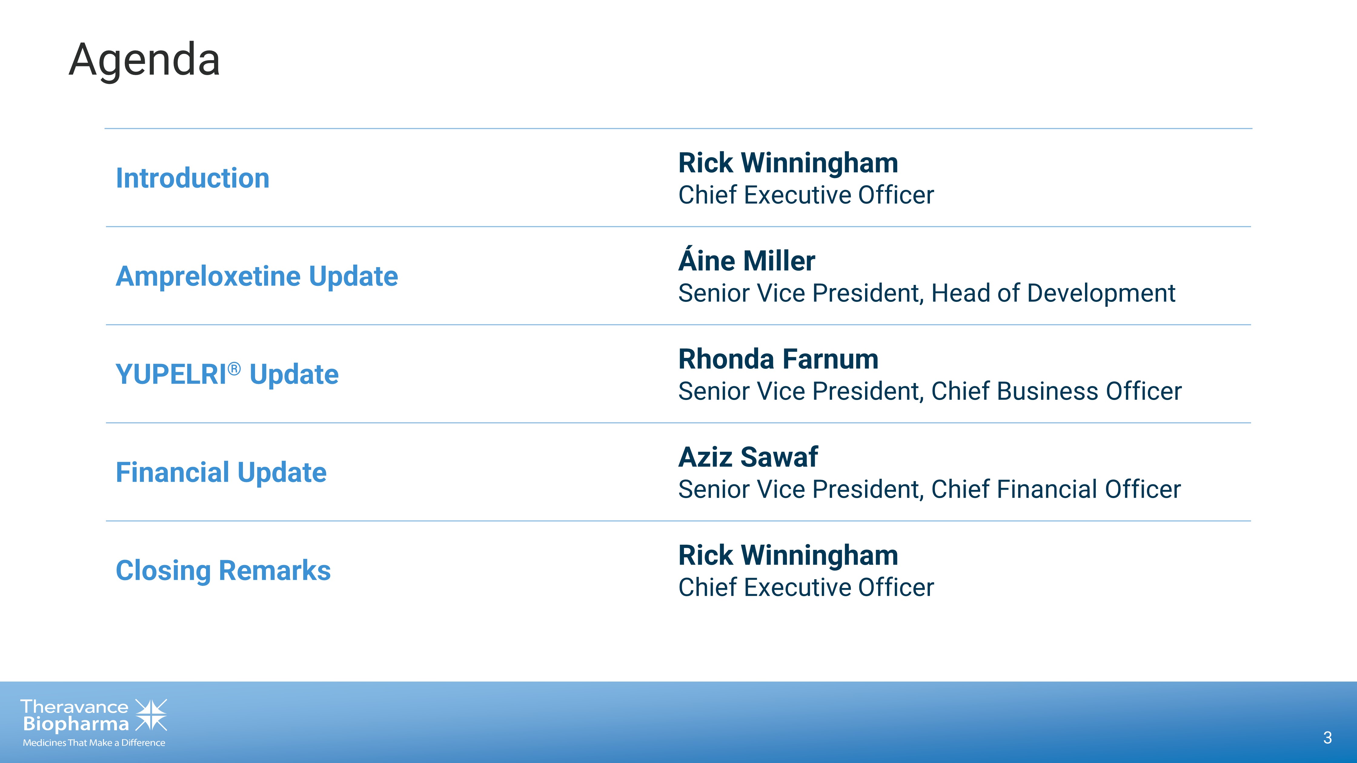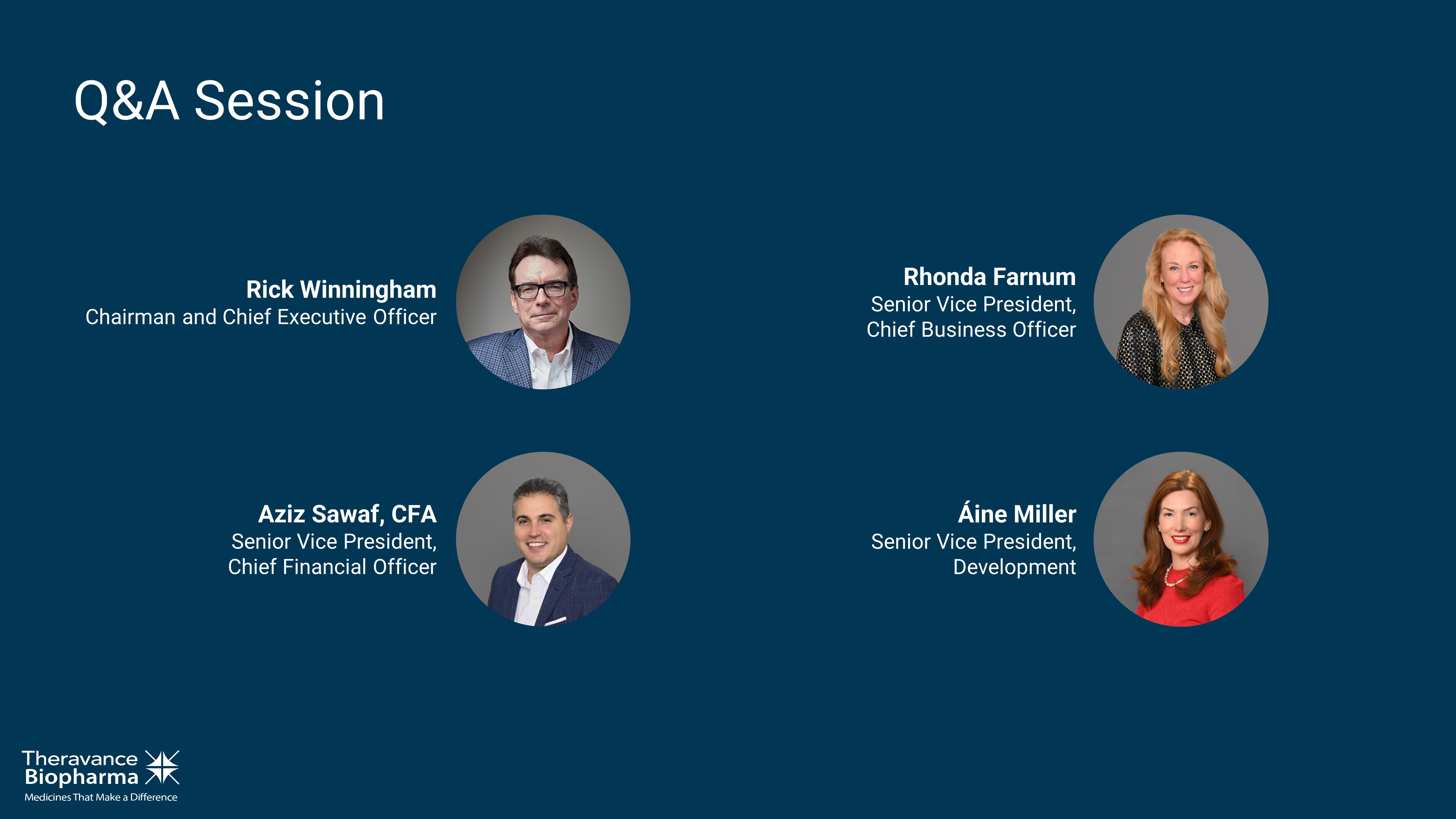 Rick Winningham Chairman and Chief Executive Officer Aziz Sawaf, CFA Senior Vice President, Chief Financial Officer Rhonda Farnum Senior Vice President, Chief Business Officer Áine Miller Senior Vice President, Development Q&A Session