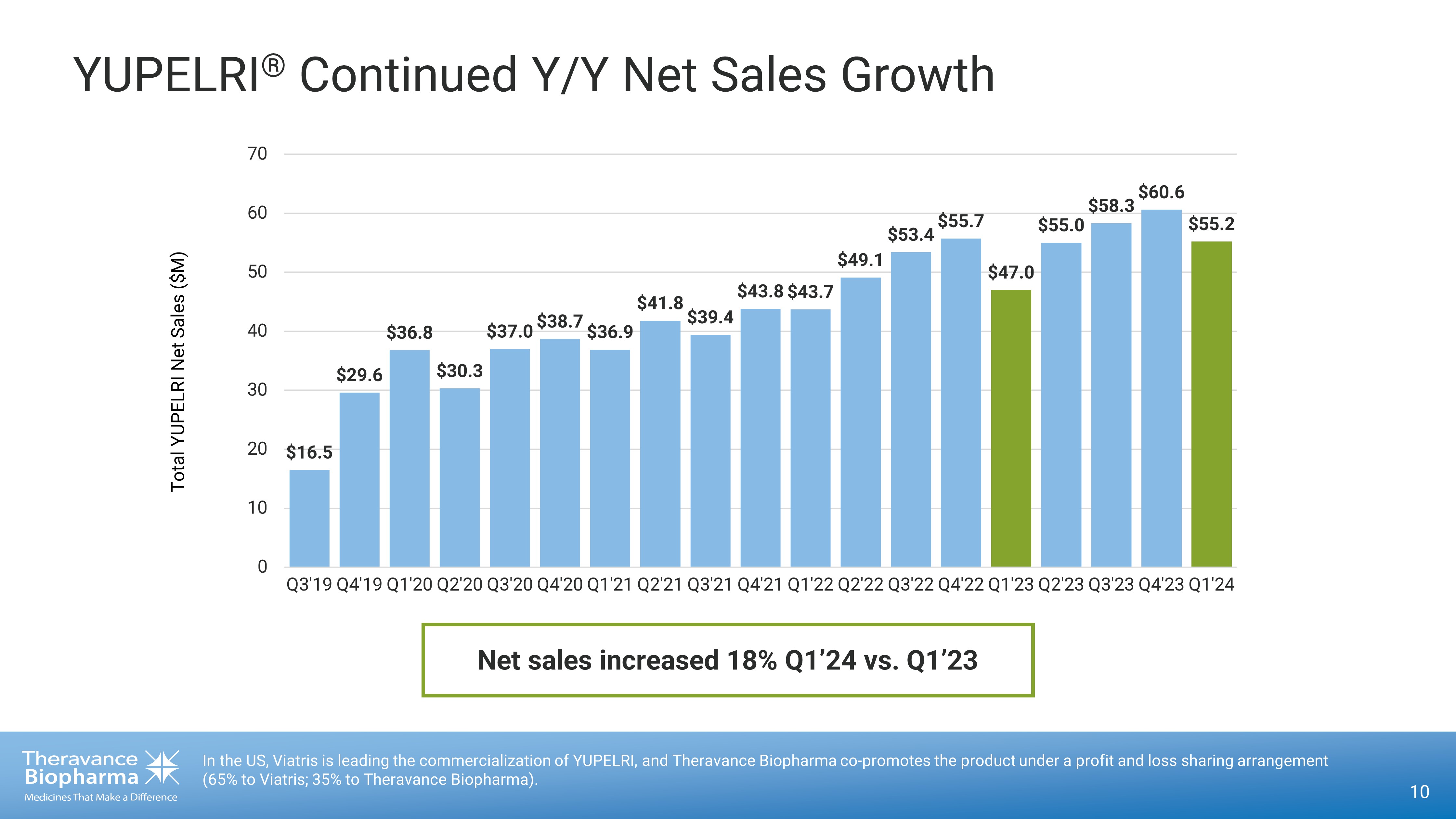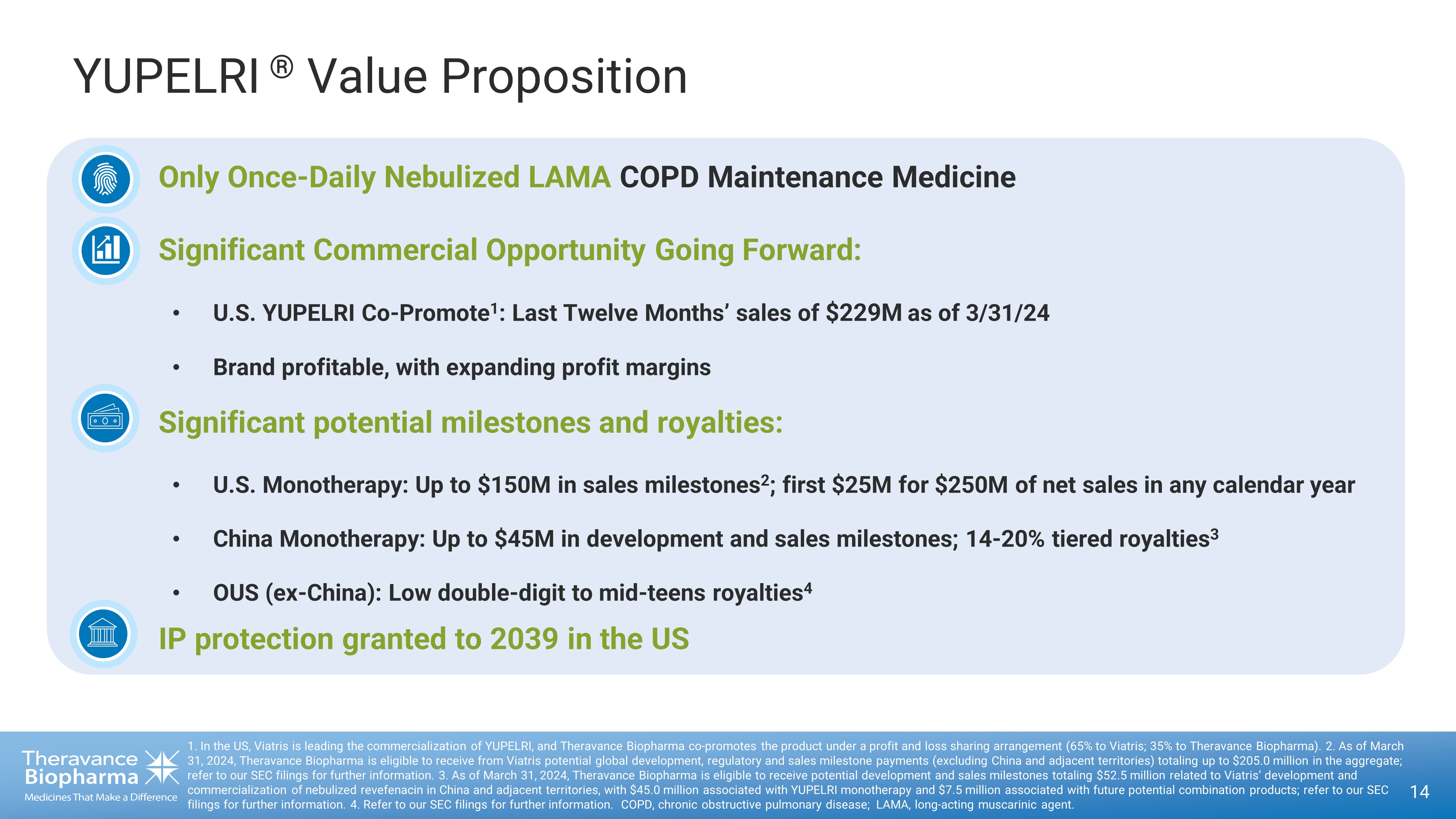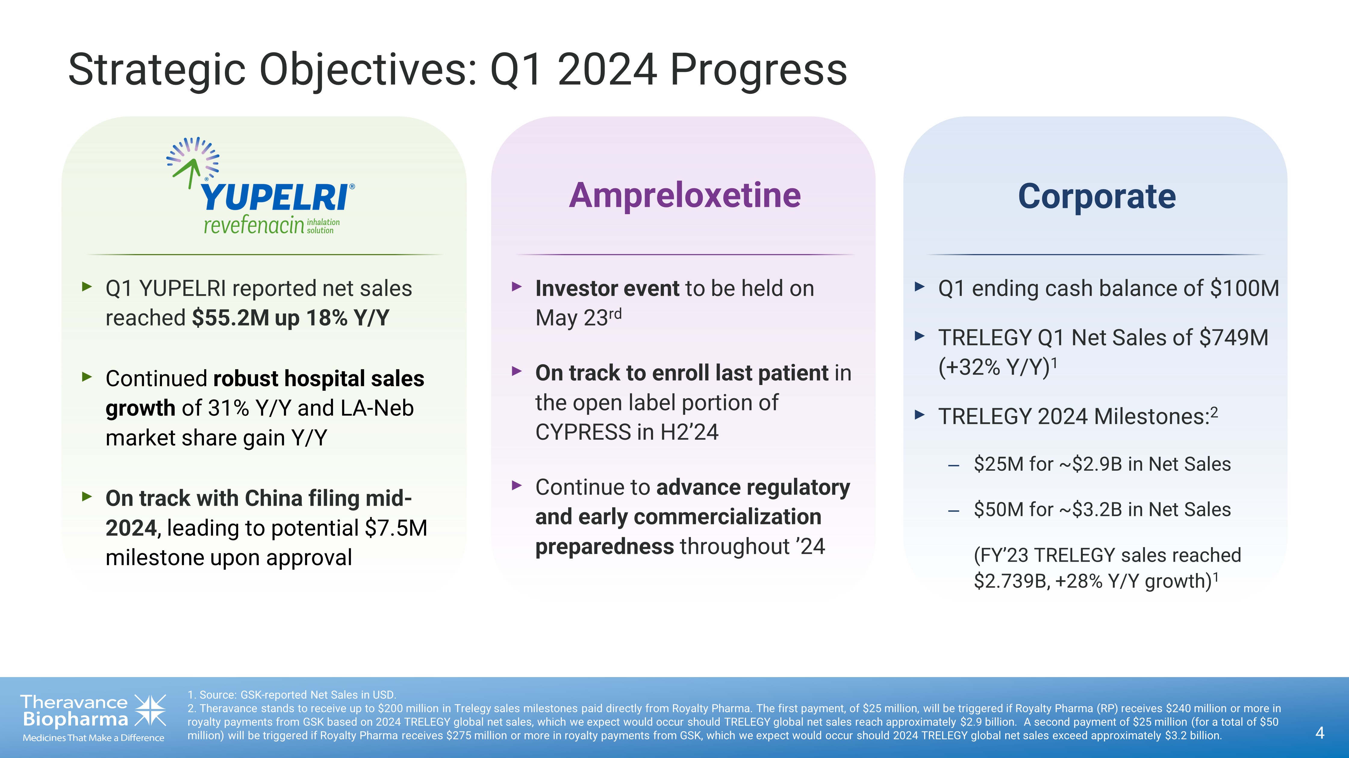Forward Looking Statements This presentation contains certain "forward - looking" statements as that term is defined in the Private Securities Litigation Ref orm Act of 1995 regarding, among other things, statements relating to goals, plans, objectives, expectations and future events. Theravance Biopharma, Inc. (the “Company”) intends such forward - looking state ments to be covered by the safe harbor provisions for forward - looking statements contained in Section 21E of the Securities Exchange Act of 1934, as amended, and the Private Securities Litigation Re form Act of 1995. Examples of such statements include statements relating to: the Company’s expectations regarding its future profitability, ex pen ses and uses of cash, the Company’s goals, designs, strategies, plans and objectives, future growth of YUPELRI sales, future royalty payments, the ability to provide value to shareholders, the Compan y’s regulatory strategies and timing of clinical studies, possible safety, efficacy or differentiation of our investigational therapy, the status of patent infringement litigation initiated by the Company and its pa rtner against certain generic companies in federal district courts; contingent payments due to the Company from the sale of the Company’s TRELEGY ELLIPTA royalty interests to Royalty Pharma, and expectati ons around the use of OHSA scores as endpoints for clinical trials. These statements are based on the current estimates and assumptions of the management of Theravance Biopharma as of the date of thi s p ress release and the conference call and are subject to risks, uncertainties, changes in circumstances, assumptions and other factors that may cause the actual results of Theravance Biopha rma to be materially different from those reflected in the forward - looking statements. Important factors that could cause actual results to differ materially from those indicated by such forward - looking statements include, among others, risks related to: factors that could increase the Company’s cash requirements or expenses beyond its expectations and any factors that could adversely affect its profitabi lit y, whether the milestone thresholds can be achieved, delays or difficulties in commencing, enrolling or completing clinical studies, the potential that results from clinical or non - clinical studies indicate the Company’s product candidates or product are unsafe, ineffective or not differentiated, risks of decisions from regulatory authorities that are unfavorable to the Company, dependence on third parti es to conduct clinical studies, delays or failure to achieve and maintain regulatory approvals for product candidates, risks of collaborating with or relying on third parties to discover, develop, manufacture a nd commercialize products, and risks associated with establishing and maintaining sales, marketing and distribution capabilities with appropriate technical expertise and supporting infrastructure, the abilit y o f the Company to protect and to enforce its intellectual property rights, volatility and fluctuations in the trading price and volume of the Company’s shares, and general economic and market conditions. Other risks affecting the Company are in the Company’s Form 10 - K filed with the SEC on March 1, 2024, and other periodic reports filed with the SEC. In addition to the risks described above and in Theravance Biopharma's filings with the SEC, other unknown or unpredictable factors also could affect Theravance Biopharma’s res ults. No forward - looking statements can be guaranteed, and actual results may differ materially from such statements. Given these uncertainties, you should not place undue reliance on these forward - look ing statements. Theravance Biopharma assumes no obligation to update its forward - looking statements on account of new information, future events or otherwise, except as required by law. Non - GAAP Financial Measures Theravance Biopharma provides a non - GAAP profitability target and a non - GAAP metric in this press release. Theravance Biopharma believes that the non - GAAP profitability target and non - GAAP net profit (loss) from continuing operations provide meaningful information to assist investors in assessing prospects for future perfor man ce and actual performance as they provide better metrics for analyzing the performance of its business by excluding items that may not be indicative of core operating results and the Company's cash po sit ion. Because non - GAAP financial targets and metrics, such as non - GAAP profitability and non - GAAP net loss from continuing operations, are not standardized, it may not be possible to compare these me asures with other companies' non - GAAP targets or measures having the same or a similar name. Thus, Theravance Biopharma's non - GAAP measures should be considered in addition to, not as a substitute for, or in isolation from, the Company's actual GAAP results and other targets. Please see the appendix attached to this presentation for a reconciliation of non - GAAP net profit (loss) from continuing operati ons to its corresponding measure, net profit (loss) from continuing operations. A reconciliation of non - GAAP net profit (loss) from continuing operations to its corresponding GAAP measure is not available on a forward - looking basis without unreasonable effort due to the uncertainty regarding, and the potential variability of, expenses and other factors in the future. 2