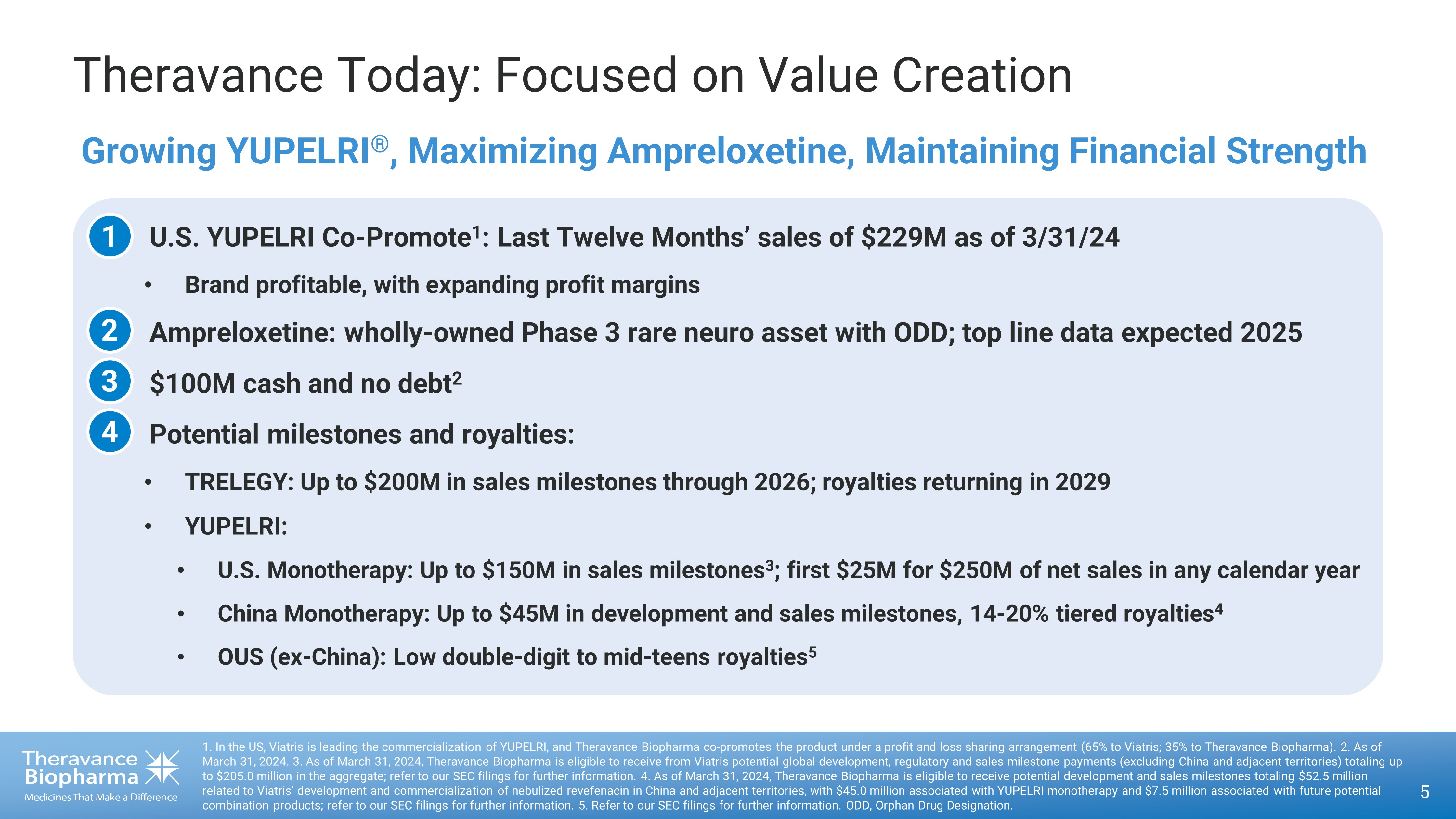 Strategic Objectives: Q1 2024 Progress 4 1. Source: GSK - reported Net Sales in USD. 2. Theravance stands to receive up to $200 million in Trelegy sales milestones paid directly from Royalty Pharma. The first p aym ent, of $25 million, will be triggered if Royalty Pharma (RP) receives $240 million or more in royalty payments from GSK based on 2024 TRELEGY global net sales, which we expect would occur should TRELEGY global net sales re ach approximately $2.9 billion. A second payment of $25 million (for a total of $50 million) will be triggered if Royalty Pharma receives $275 million or more in royalty payments from GSK, which we expect woul d o ccur should 2024 TRELEGY global net sales exceed approximately $3.2 billion. Corporate ‣ Q1 ending cash balance of $100M ‣ TRELEGY Q1 Net Sales of $749M (+32% Y/Y) 1 ‣ TRELEGY 2024 Milestones: 2 – $25M for ~$2.9B in Net Sales – $50M for ~$3.2B in Net Sales (FY’23 TRELEGY sales reached $2.739B, +28% Y/Y growth) 1 ‣ Investor event to be held on May 23 rd ‣ On track to enroll last patient in the open label portion of CYPRESS in H2’24 ‣ Continue to advance regulatory and early commercialization preparedness throughout ’24 Ampreloxetine ‣ Q1 YUPELRI reported net sales reached $55.2M up 18% Y/Y ‣ Continued robust hospital sales growth of 31% Y/Y and LA - Neb market share gain Y/Y ‣ On track with China filing mid - 2024 , leading to potential $7.5M milestone upon approval