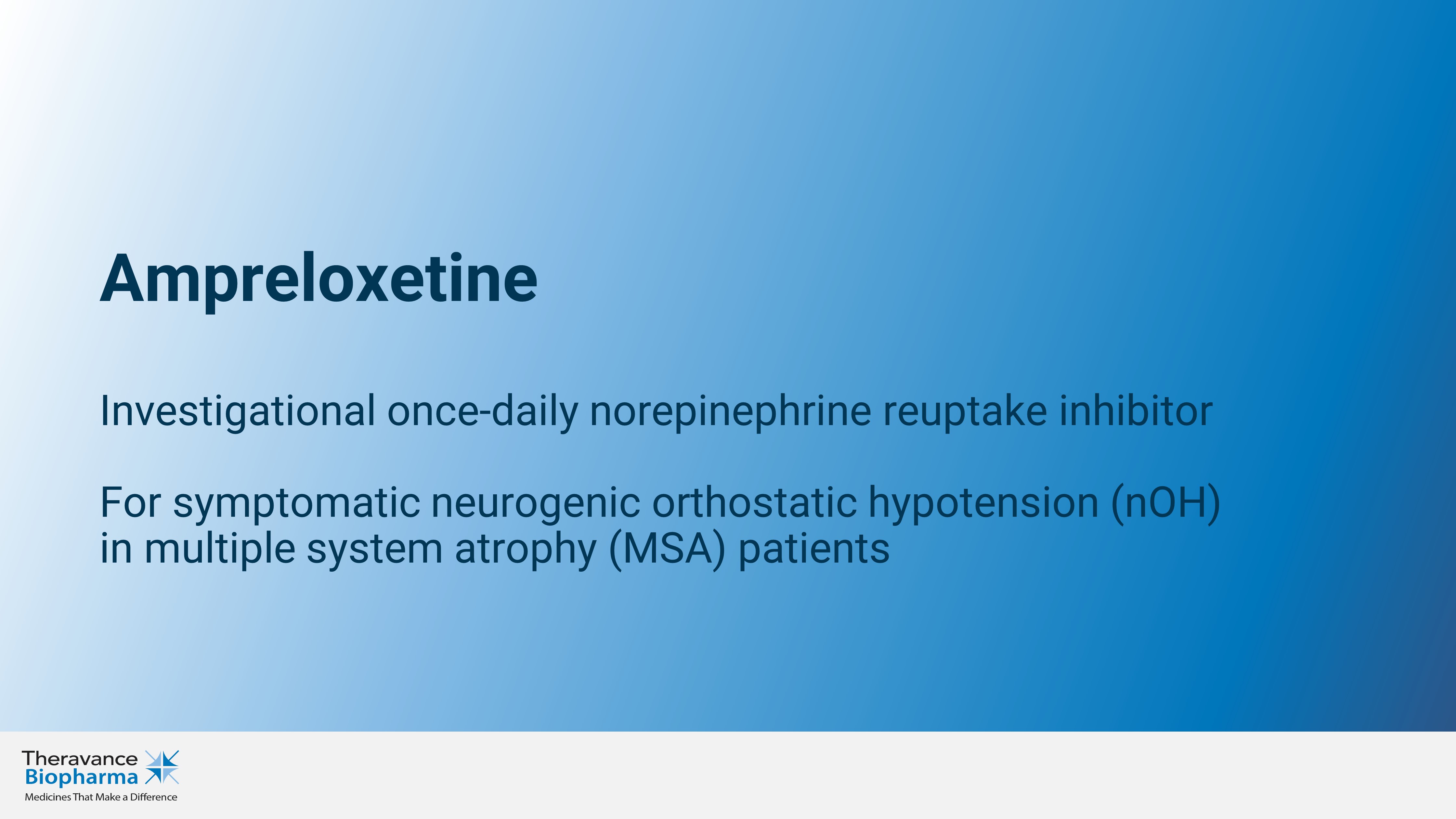 Ampreloxetine Investigational once - daily norepinephrine reuptake inhibitor For symptomatic neurogenic orthostatic hypotension (nOH) in multiple system atrophy (MSA) patients