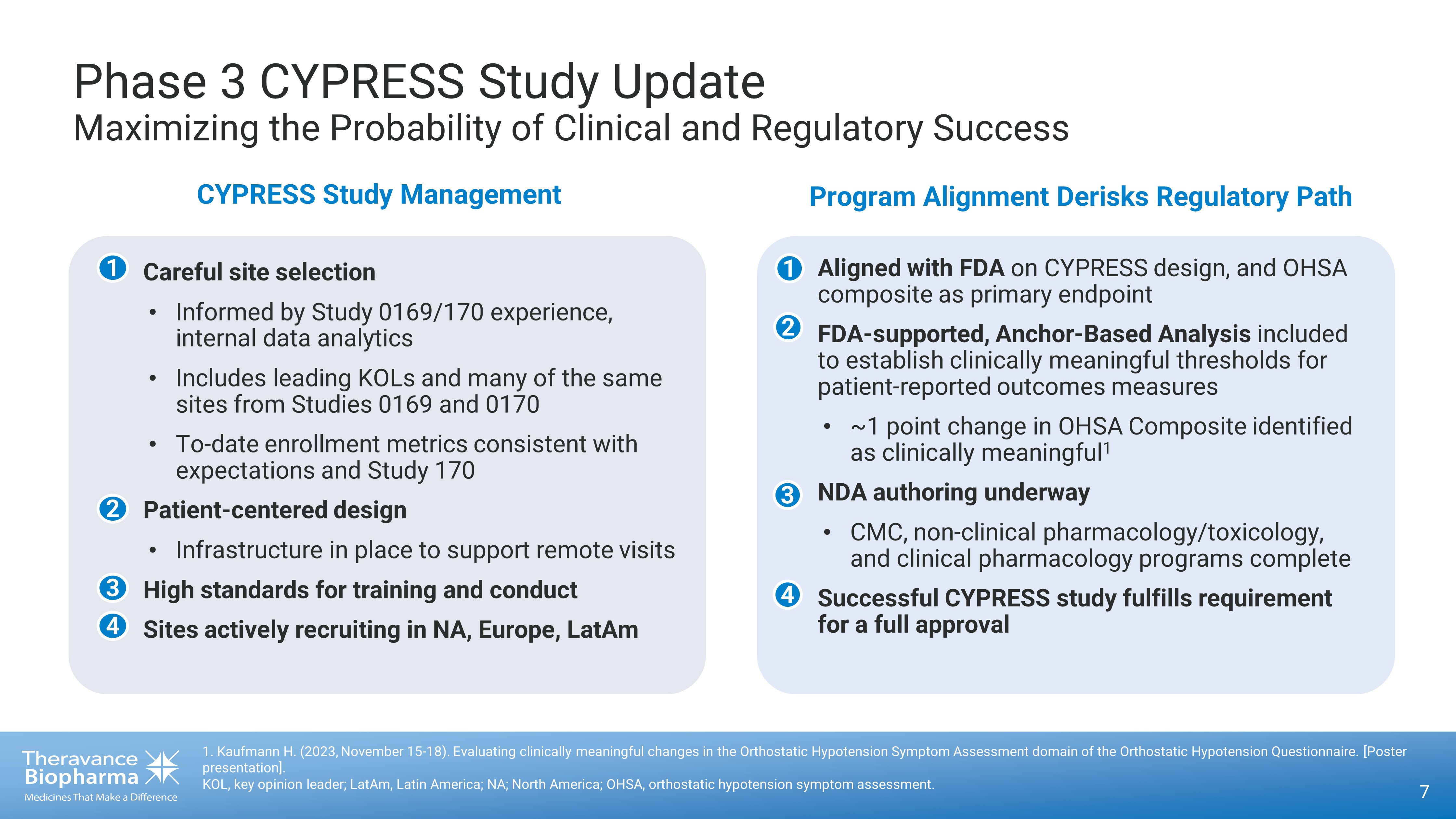 Phase 3 CYPRESS Study Update Maximizing the Probability of Clinical and Regulatory Success 7 1. Kaufmann H. (2023, November 15 - 18). Evaluating clinically meaningful changes in the Orthostatic Hypotension Symptom Assessmen t domain of the Orthostatic Hypotension Questionnaire. [Poster presentation]. KOL, key opinion leader; LatAm, Latin America; NA; North America; OHSA, orthostatic hypotension symptom assessment. Program Alignment Derisks Regulatory Path CYPRESS Study Management • Careful site selection • Informed by Study 0169/170 experience, internal data analytics • Includes leading KOLs and many of the same sites from Studies 0169 and 0170 • To - date enrollment metrics consistent with expectations and Study 170 • Patient - centered design • Infrastructure in place to support remote visits • High standards for training and conduct • Sites actively recruiting in NA, Europe, LatAm • Aligned with FDA on CYPRESS design, and OHSA composite as primary endpoint • FDA - supported, Anchor - Based Analysis included to establish clinically meaningful thresholds for patient - reported outcomes measures • ~1 point change in OHSA Composite identified as clinically meaningful 1 • NDA authoring underway • CMC, non - clinical pharmacology/toxicology, and clinical pharmacology programs complete • Successful CYPRESS study fulfills requirement for a full approval 1 3 2 1 2 3 4 4
