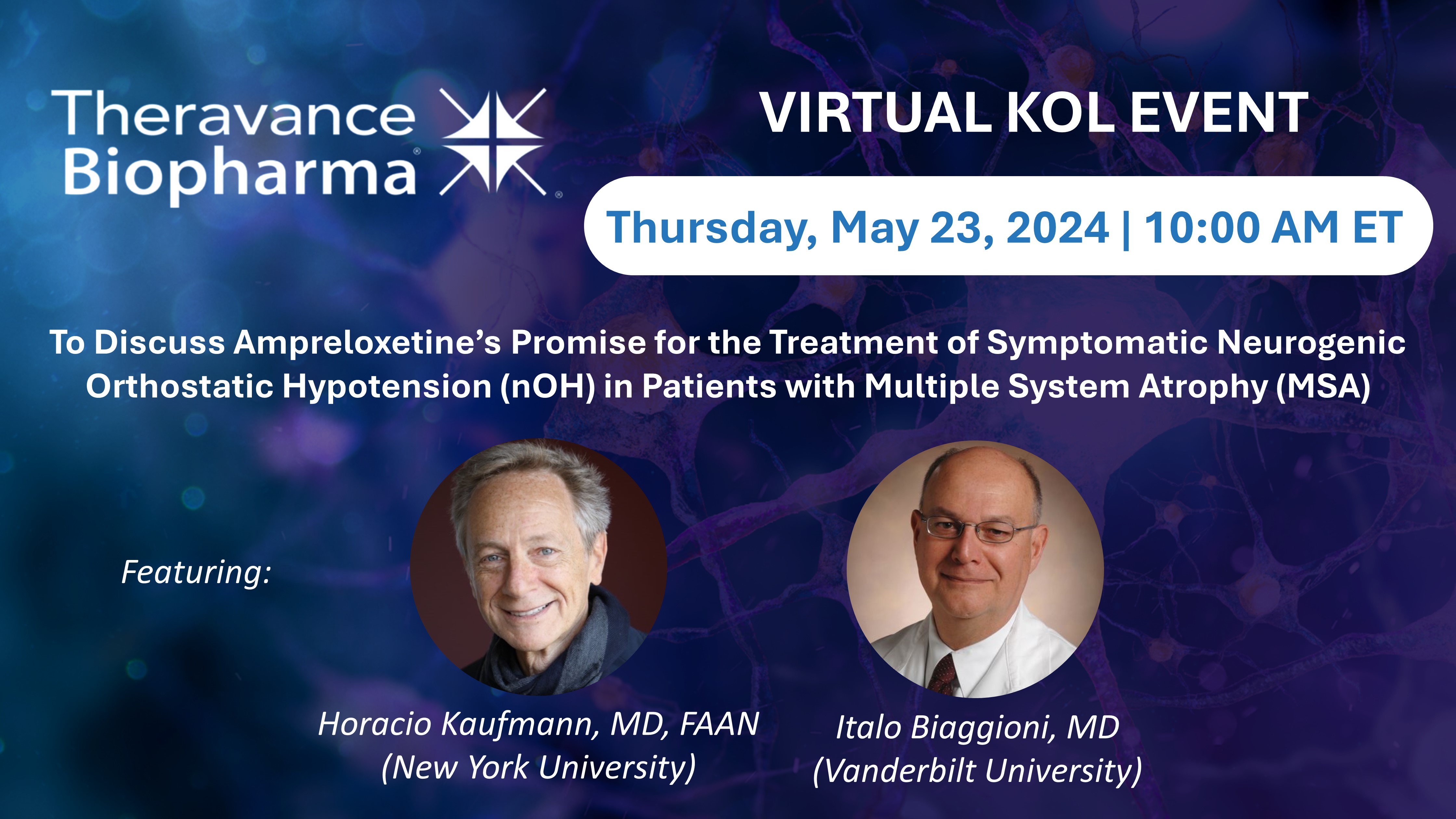 VIRTUAL KOL EVENT To Discuss Ampreloxetine’s Promise for the Treatment of Symptomatic Neurogenic Orthostatic Hypotension (nOH) in Patients with Multiple System Atrophy (MSA) Horacio Kaufmann, MD, FAAN (New York University) Thursday, May 23, 2024 | 10:00 AM ET Italo Biaggioni, MD (Vanderbilt University) Featuring: