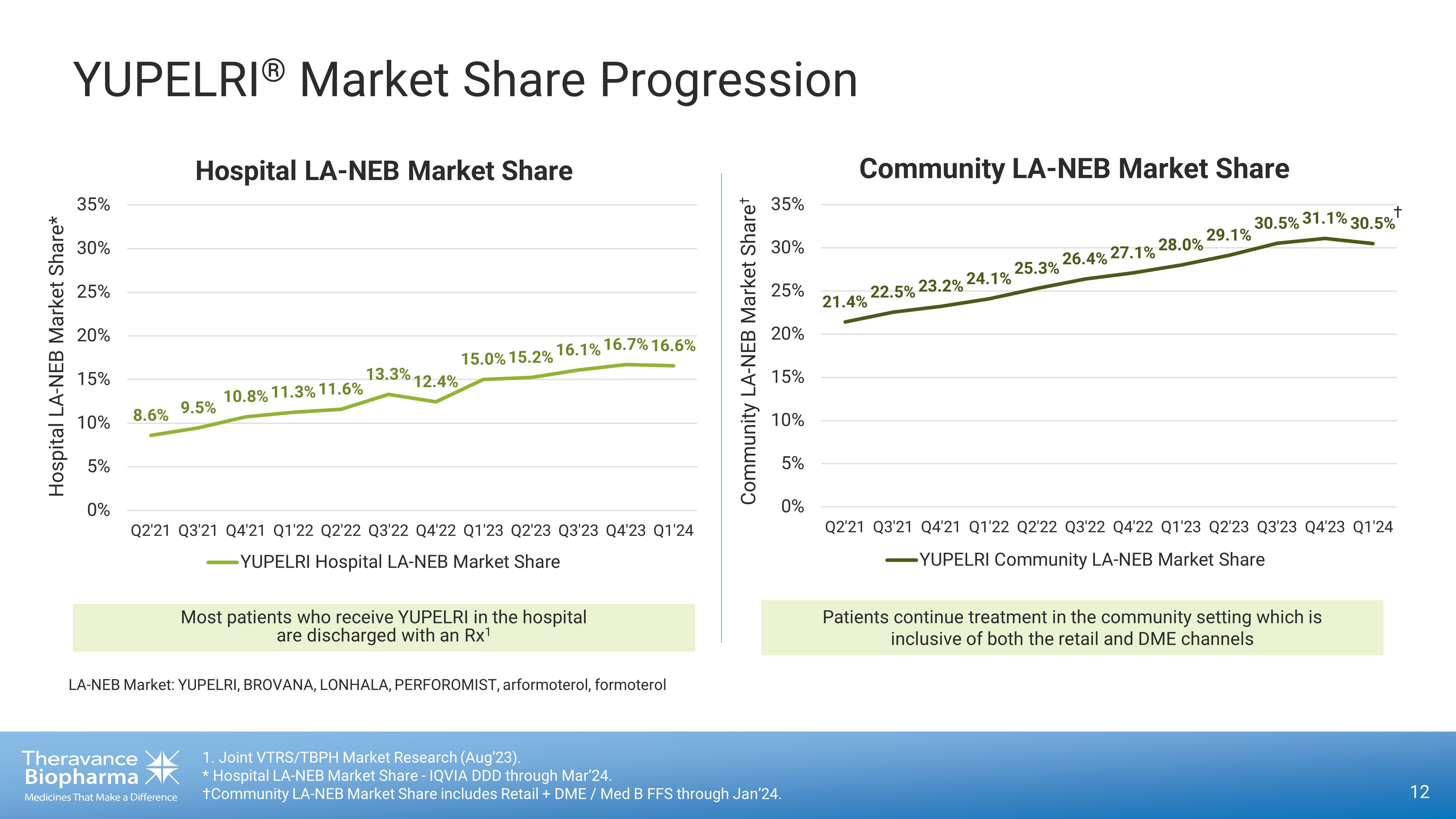 Theravance Hospital Execution Drives Value 11 1. Source: IQVIA DDD, HDS, VA and Non - Reporting Hospital through Mar’24. Preliminary data subject to revision upon receipt of fi nal data. 19K 30K 54K 34K 47K 54K 56K 70K 78K 93K 98K 108K 113K 138K 162K 158K 162K 191K 213K 0K 50K 100K 150K 200K 250K Q3'19 Q4'19 Q1'20 Q2'20 Q3'20 Q4'20 Q1'21 Q2'21 Q3'21 Q4'21 Q1'22 Q2'22 Q3'22 Q4'22 Q1'23 Q2'23 Q3'23 Q4'23 Q1'24 YUPELRI Hospital Doses Hospital sales (doses) increased 31% Q1’24 vs. Q1’23 1