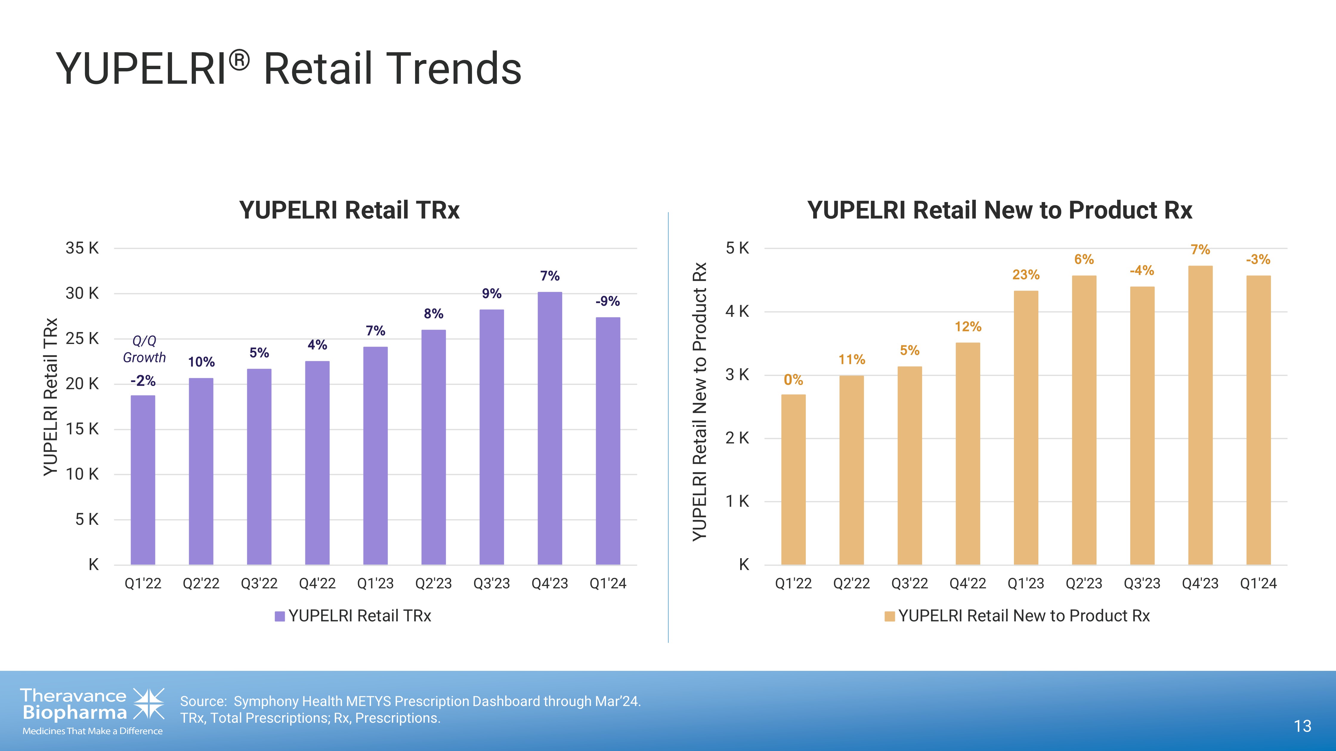 YUPELRI ® Market Share Progression 12 1. Joint VTRS/TBPH Market Research (Aug’23). * Hospital LA - NEB Market Share - IQVIA DDD through Mar’24. †Community LA - NEB Market Share includes Retail + DME / Med B FFS through Jan’24. 8.6% 9.5% 10.8% 11.3% 11.6% 13.3% 12.4% 15.0% 15.2% 16.1% 16.7% 16.6% 0% 5% 10% 15% 20% 25% 30% 35% Q2'21 Q3'21 Q4'21 Q1'22 Q2'22 Q3'22 Q4'22 Q1'23 Q2'23 Q3'23 Q4'23 Q1'24 Hospital LA - NEB Market Share* YUPELRI Hospital LA-NEB Market Share Patients continue treatment in the community setting which is inclusive of both the retail and DME channels 21.4% 22.5% 23.2% 24.1% 25.3% 26.4% 27.1% 28.0% 29.1% 30.5% 31.1% 30.5% 0% 5% 10% 15% 20% 25% 30% 35% Q2'21 Q3'21 Q4'21 Q1'22 Q2'22 Q3'22 Q4'22 Q1'23 Q2'23 Q3'23 Q4'23 Q1'24 Community LA - NEB Market Share † YUPELRI Community LA-NEB Market Share Most patients who receive YUPELRI in the hospital are discharged with an Rx 1 LA - NEB Market: YUPELRI, BROVANA, LONHALA, PERFOROMIST, arformoterol, formoterol Hospital LA - NEB Market Share Community LA - NEB Market Share †