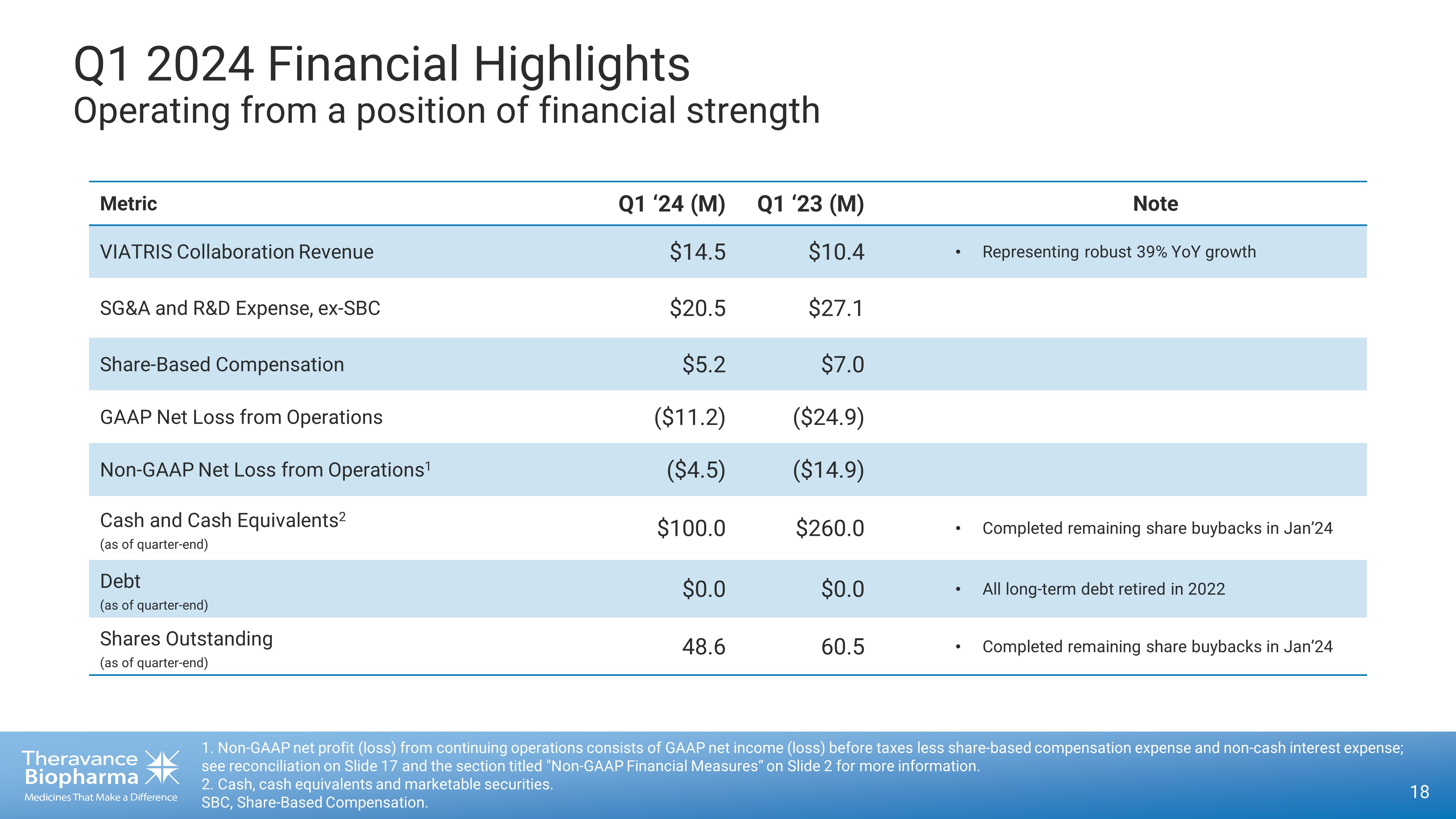 16 1. Amounts include share - based compensation. 2. Non - GAAP net profit (loss) from continuing operations consists of GAAP net loss before taxes excluding share - based compensati on expense and non - cash interest expense; see reconciliation on Slide 17 and the section titled "Non - GAAP Financial Measures“ on Slide 2 for more information. First Quarter 2024 Financials (Unaudited) ($, in thousands) Revenue: Viatris collaboration agreement $ 14,503 $ 10,411 Collaboration revenue - 6 Total revenue 14,503 10,417 Costs and expenses: Research and development (1) 8,968 14,572 Selling, general and administrative (1) 16,742 19,183 Restructuring and related expenses (1) - 1,574 Total costs and expenses 25,710 35,329 Loss from operations (before tax and other income & expense) $ (11,207) $ (24,912) Share-based compensation expense: Research and development 1,465 2,441 Selling, general and administrative 3,764 4,223 Restructuring and related expenses - 357 Total share-based compensation expense 5,229 7,021 Operating expense excl. share-based compensation: R&D operating expense (excl. share-based compensation) 7,503 12,131 SG&A operating expense (excl. share-based compensation) 12,978 14,960 Total operating expenses excl. share-based compensation $ 20,481 $ 27,091 Non-GAAP net loss (2) $ (4,544) $ (14,912) Three Months Ended March 31, 2024 2023 (Unaudited)